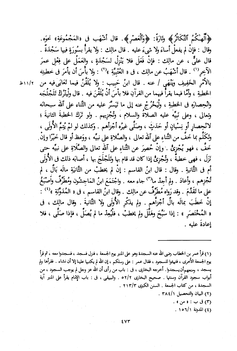 {أَلْهَاكُمُ التَّكَاثُرُ} وتارة: {وَالْعَصْرِ}. قال أشهب في المجموعة نحوه. وقال: فإن لم يفعل أساء ولا شيء عليه. قال مالك: ولا يقرأ بسورة فيها سجدة. قال عليٌّ، عن مالك: فإن فعل فلا ينزلْ لسجدة، والعمل على فِعْل عمر الآخِرِ. قال أشهب عن مالك، في الْعُتْبِيَّة: ولا بأس أن يأمر في خطبته بالأمر الخفيف وينهى عنه. قَالَ ابْنُ حَبِيبٍ: ولا يُلَقَّنُ فيما تعايى فيه من الخطبة، وأما فيما يقرأ فيهما من القرآن فلا بأس أن يُلَقَّنَ فيه. قال: وليترك تلجلجه وانحصاره في الخطبة، وليخرج عنه إلى ما تيسَّرَ عليه من الثناء على الله سبحانه وتعالى، وعلى نبيه عليه الصلاة والسلام، وتُجزيهم. ولو ترك الخطبة الثانية؛ لانحصار أو نسيان أو حدث، وصلى غيره أجزأهم. وكذلك لو لم يُتِمَّ الأولى، وتكلَّمّ بما خفَّ من الثناء على الله تعالى، والصلاة على نبيه، ووعظ أو قال خيرًا، وإن خفَّ، فهو يُجزئ. وإن حُصِر عن الثناء على الله تعالى والصلاة على نبيه حتى نزل، فهي خطبة، وتجزئ إذا كان قد قام بها وتلجلج بها، أصابه ذلك في الأولى أم في الثانية. وقال: قَالَ ابْنُ الْقَاسِمِ: إن لم يخطب من الثانية ما له بالٌ، لم تجزهم، وأعاد. ولم أجدْ ما جاء معه. واجتمع ابن الماجشون ومطرف وأصبغ على ما تقدَّم. وقد رواه مطرف عن مالك. وقَالَ ابْنُ الْقَاسِمِ، في المدونة: إن خطب بما له بالٌ أجزأهم. ولم يذكر الأولى ولا الثانية. وقال مالك، في المختصر: إذا سبَّح وهلَّل ولم يخطب، فَلْيُعِدْ ما لم يُصَلِّ، فإذا صَلَّى فلا إعادة عليه.