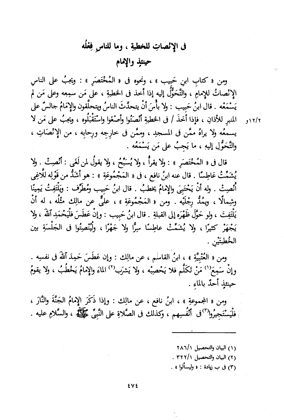 ومن كتاب ابن حبيب، ونحوه في المختصر: ويجب على الناس الإنصات للإمام، والتحول إليه إذا أخذ في الخطبة، على من سمعه وعلى من لم يسمعه. قَالَ ابْنُ حَبِيبٍ: ولا بأس أن يتحدث الناس ويتحلقون والإمام جالس على المنبر للأذان، فإذا أخذ في الخطبة أنصتوا وأصغوا واستقبلوه، ويجب على من لا يسمعه ولا يراه ممن في المسجد، وممن في خارجه ورحابه، من الإنصات، والتحول إليه، ما يجب على من يسمعه.