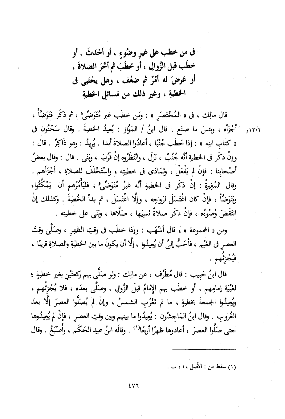 قال مالك، في المختصر: ومن خطب غير متوضئ، ثم ذكر فتوضأ، أجزأه، وبئس ما صنع. قَالَ ابْنُ المواز: يعيد الخطبة. وقال سحنون في كتاب ابنه: إذا خطب جُنُبًا، أعادوا الصلاة أَبَدًا. يريد: وهو ذاكر. قال: وإن ذكر في الخطبة أنه جُنُبٌ نزل، وانتظروه إن قرب وبنى. قال: وقال بعض أصحابنا: فإن لم يفعل وتمادى في خطبته، واستخلف للصلاة، أجزأهم. وقال المغيرة: إن ذكر في الخطبة أنه غير متوضئ فليأمرهم أن يمكثوا ويتوضأ، فإن كان اغتسل لرواحه وإلا اغتسل، ثم بدأ الخطبة. وكذلك إن انتقض وضوءه، فإن ذكر صلاة نسيها، صلاها، وبنى على خطبته.