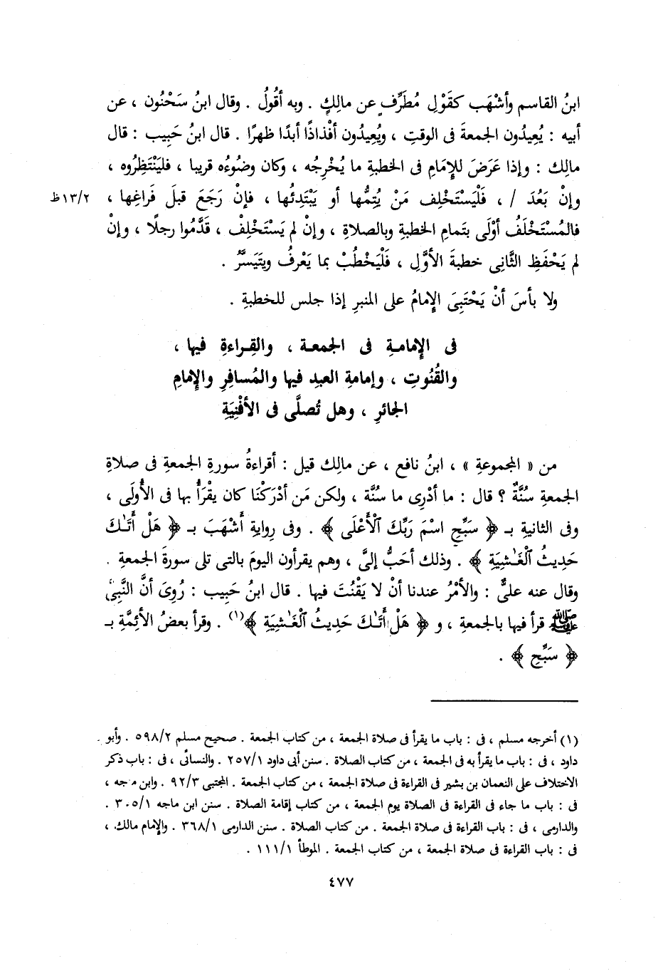 من المجموعة ابن نافع، عن مالك قيل: أقراءة سورة الجمعة في صلاة الجمعة سُنَّة؟ قال: ما أدري ما سُنَّة، ولكن من أدركنا كان يقرأ بها في الأولى، وفي الثانية بـ {سبح اسم ربك الأعلى}. وفي رواية أشهب بـ {هل أتاك حديث الغاشية}. وذلك أَحَبُّ إِلَيَّ، وهم يقرأون اليوم بالتي تلي سورة الجمعة. وقال عنه عليٌّ: والأمر عندنا أن لا يقنت فيها. قَالَ ابْنُ حَبِيبٍ: روي أن النبي صلى الله عليه وسلم قرأ فيها بالجمعة، و {هل أتاك حديث الغاشية}. وقرأ بعض الأئمة بـ {سبح}.