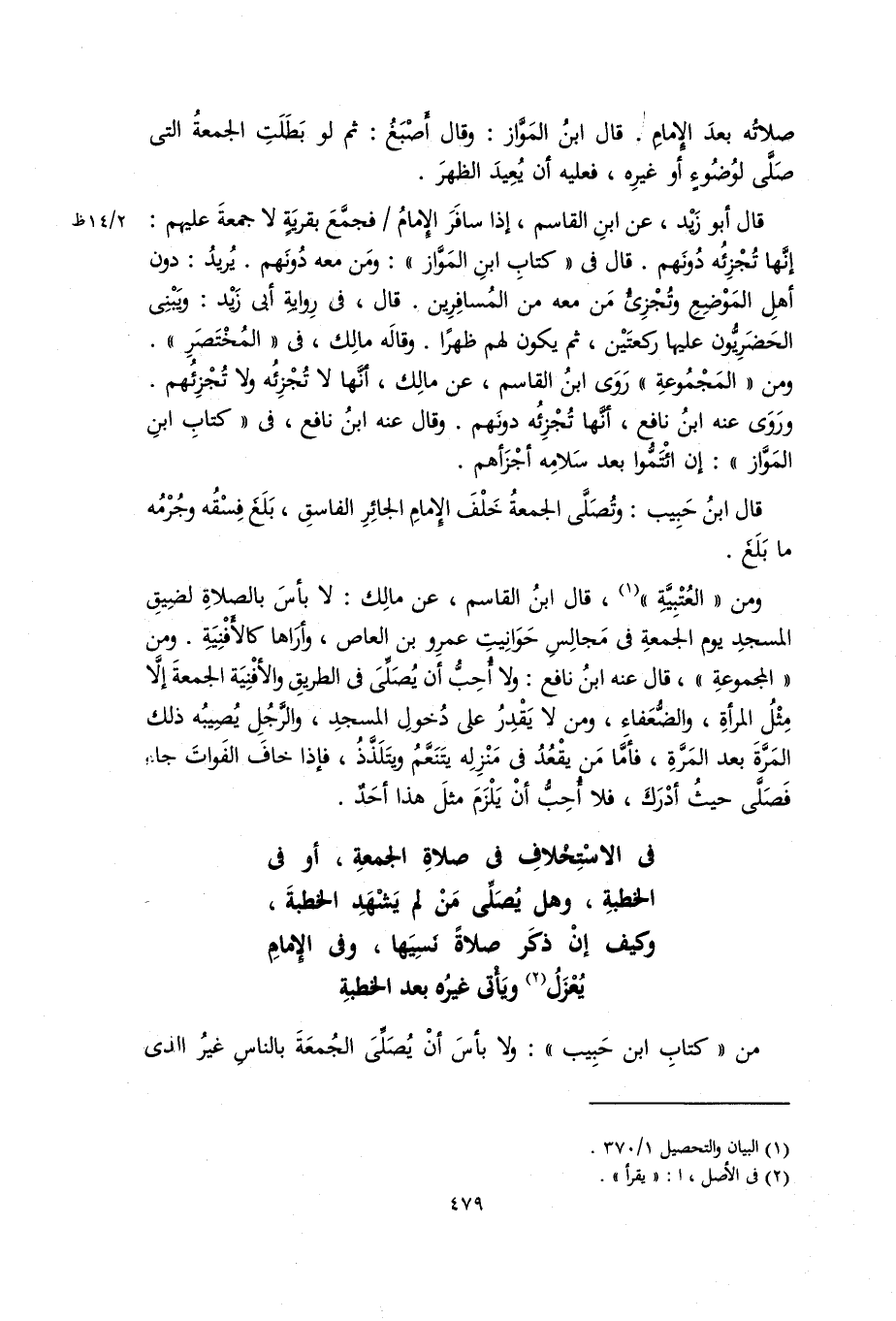 ومن الْعُتْبِيَّة، قَالَ ابْنُ الْقَاسِمِ، عن مالك: لا بأس بالصلاة لضيق المسجد يوم الجمعة في مجالس حوانيت عمرو بن العاص، وأراها كالأفنية. ومن المجموعة، قال عنه ابن نافع: ولا أُحِبُّ أن يُصَلِّي في الطريق والأفنية الجمعة إلا مثل المرأة والضعفاء، ومن لا يقدر على دخول المسجد، والرجل يصيبه ذلك المرة بعد المرة، فأما من يقعد في منزله يتنَعَّمُ ويتلذَّذُ، فإذا خاف الفوات جاء فَصَلَّى حيث أدرك، فلا أُحِبُّ أَنْ يلزم مثل هذا أحدٌ.