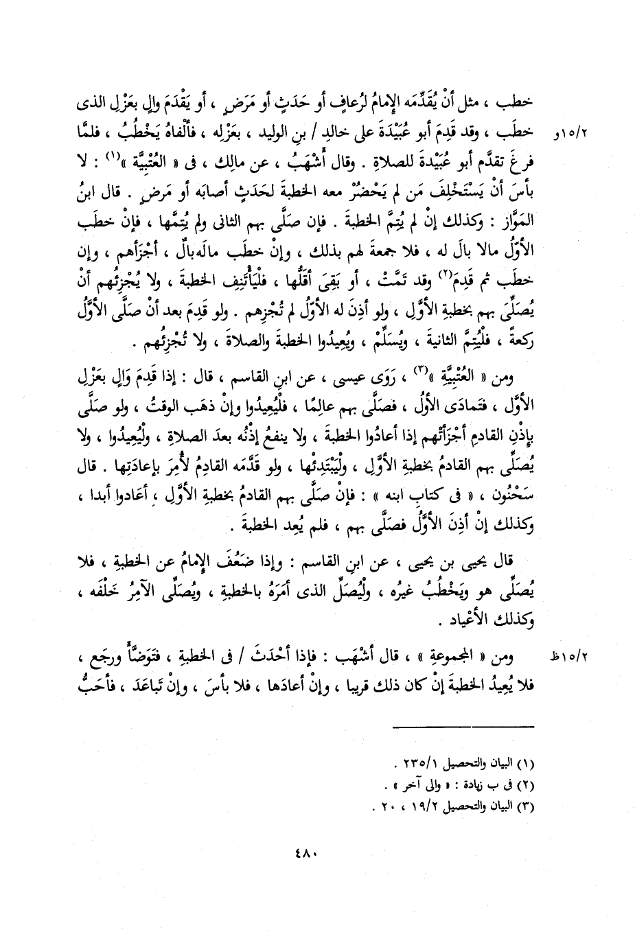 ومن الْعُتْبِيَّة روى عيسى، عن ابْن الْقَاسِمِ، قال: إذا قَدِمَ والٍ بعزل الأول، فتمادى الأول، فَصَلَّى بهم عالمًا، فليعيدوا وإن ذهب الوقت، ولو صَلَّى بإذن القادم أجزأتهم إذا أعادوا الخطبة، ولا ينفع إذنُه بعد الصلاة، وليعيدوا، ولا يُصَلِّي بهم القادم بخطبة الأول، وليبتدئها، ولو قَدَّمَه القادم لأُمِرَ بإعادتها. قال سحنون، في كتاب ابنه: فإن صَلَّى بهم القادم بخطبة الأول أعادوا أَبَدًا، وكذلك إن أذن الأول فَصَلَّى بهم، فلم يعد الخطبة.