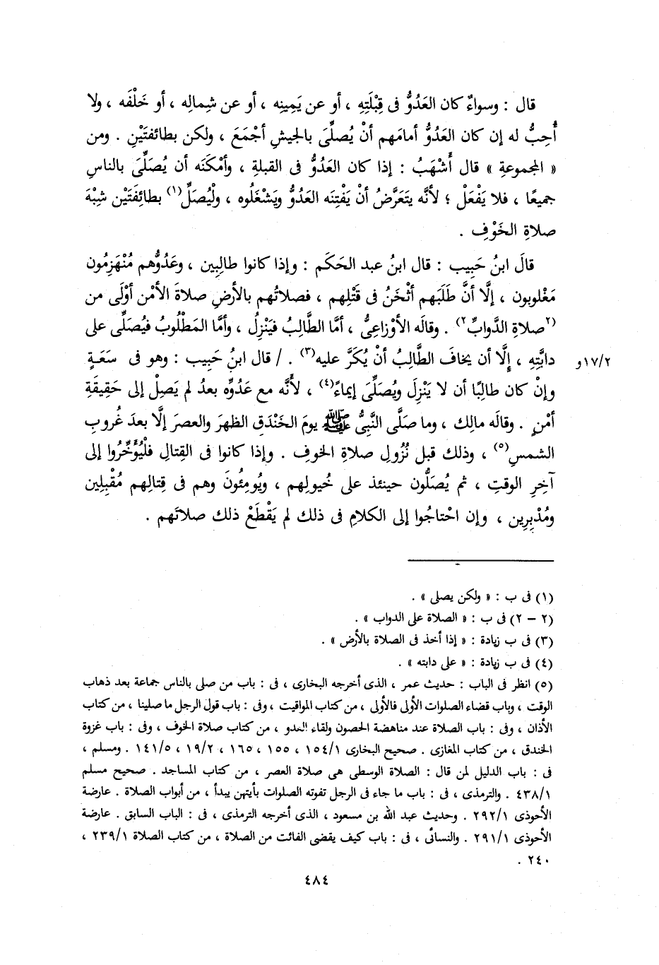 قَالَ ابْنُ حَبِيبٍ: قَالَ ابْنُ عبد الحكم: وإذا كانوا طالبين، وعدوهم منهزمون مغلوبون، إلا أن طلبهم أثخن في قتلهم، فصلاتهم بالأرض صلاة الأمن أولى من صلاة الدوابِّ. وقاله الأوزاعي، أما الطالب فينزل، وأما المطلوب فيصلي على دابَّته، إلا أن يخاف الطالب أن يُكَرَّ عليه. قَالَ ابْنُ حَبِيبٍ: وهو في سعة , إن كان طالبًا أن لا ينزل ويُصَلِّي إيماء؛ لأنه مع عدوه بعد لم يَصِلْ إلى حقيقة أمن. وقاله مالك، وما صَلَّى النبي صلى الله عليه وسلم يوم الخندق الظهر والعصر إلا بعد غروب الشمس، وذلك قبل نزول صلاة الخوف. وإذا كانوا في القتال فليؤخروا إلى آخر الوقت، ثم يُصَلُّون حينئذ على خيولهم، ويُومِئُونَ وهم في قتالهم مقبلين ومدبرين، وإن احتاجوا إلى الكلام في ذلك لم يَقطع ذلك صلاتهم.