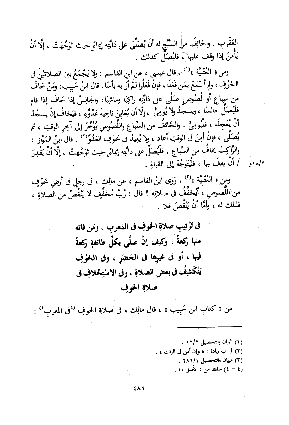 ومن الْعُتْبِيَّة، قال عيسى، عن ابْن الْقَاسِمِ: ولا يَجْمَعُ بين الصلاتين في الخوف، ولم أسمع بمن فعله، فإن فعلوا لم أرَ به بأسًا. قَالَ ابْنُ حَبِيبٍ: ومن خاف من سباع أو لصوص صَلَّى على دابته راكبًا وماشيًا، والجالس إذا خاف إذا قام فليُصَلِّ جالسًا، ويسجد ولا يُومِئُ، إلا أن يُعاين ناحية عدُوِّه، فيخاف إن يسجد أن يُعْجله، فليومئ. والخائف من السباع واللصوص يؤَخَّر إلى آخِرِ الوقت، ثم يُصَلِّي، فإن أمن في الوقت أعاد، ولا يعيد في خوف العدو. قَالَ ابْنُ المواز: والراكب يخاف من السباع، فليُصَلِّ على دابته إيماء، حيث توجَّهتْ، إلا أن يقدر أن يقف بها، فليتوجَّه إلى القبلة.
