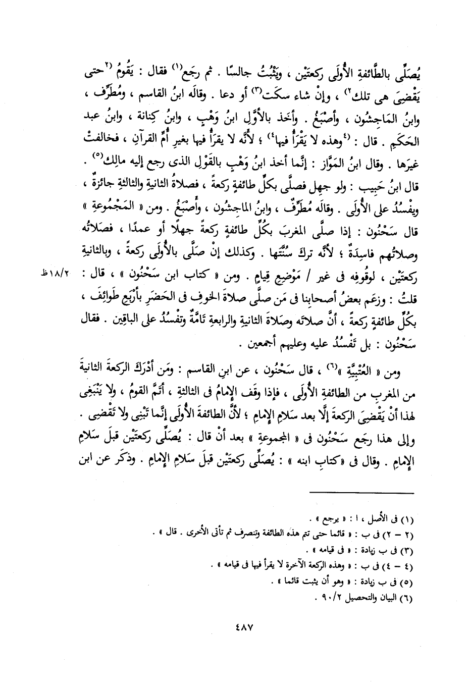 ومن الْعُتْبِيَّة، قال سحنون، عن ابْن الْقَاسِمِ: ومن أدرك الركعة الثانية من المغرب من الطائفة الأولى، فإذا وقف الإمام في الثالثة، أتَمَّ القوم، ولا ينبغي لهذا أن يقضي الركعة إلا بعد سلام الإمام؛ لأن الطائفة الأولى إنما تبني ولا تقضي. وإلى هذا رجع سحنون في المجموعة بعد أن قال: يُصَلِّي ركعتين قبل سلام الإمام. وقال في كتاب ابنه: يُصَلِّي ركعتين قبل سلام الإمام. وذكر عن ابن