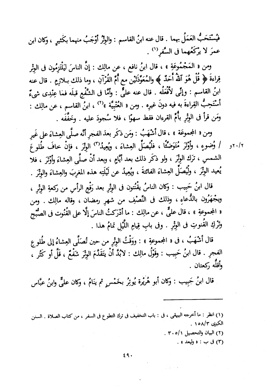 قَالَ ابْنُ حَبِيبٍ: وكان الناس يقنتون في الوتر بعد رفع الرأس من ركعة الوتر، ويجهرون بالدعاء، وذلك في النصف من شهر رمضان، وقاله مالك. ومن المجموعة، قال عليٌّ، عن مالك: ما أدركت الناس إلا على القنوت في الصبح، وترك القنوت في الوتر. وفي باب قيام الليل تمام هذا. قال أشهب، في المجموعة: ووقت الوتر من حين تُصَلِّي العشاء إلى طلوع الفجر. قَالَ ابْنُ حَبِيبٍ: وقول مالك: لا بدَّ أن يتقدَّم الوتر شفع، قلَّ أو كثر، وأقلُّه ركعتان.