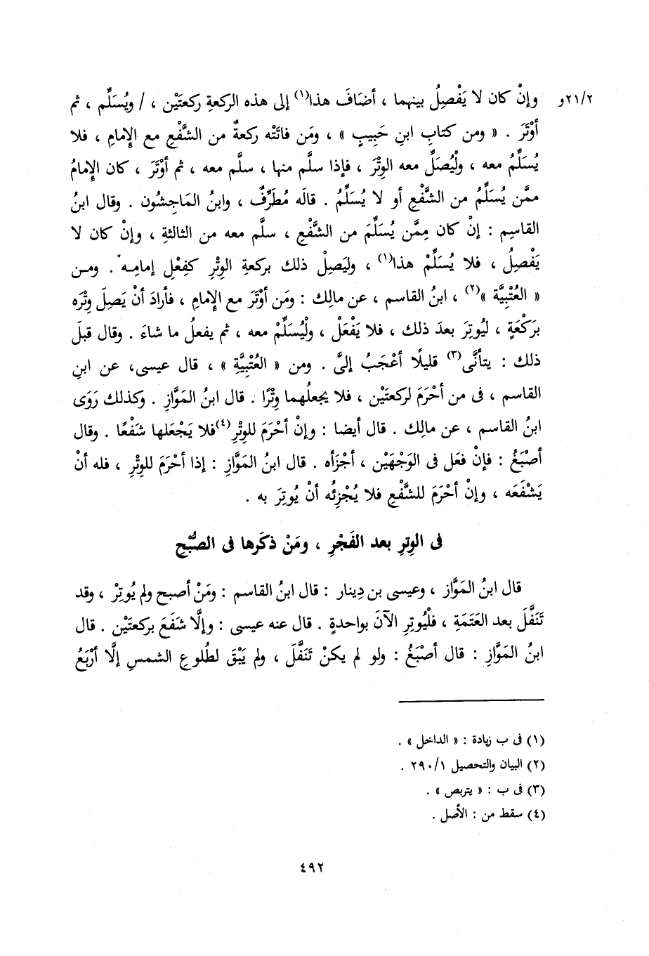 وإن كان لا يفصل بينهما، أضاف هذا إلى هذه الركعة ركعتين، ويُسَلِّم، ثم أوتر. ومن كتاب ابن حبيب، ومن فاتته ركعة من الشفع مع الإمام، فلا يُسَلِّم معه، وليُصَلِّ معه الوتر، فإذا سلَّم منها، سلَّم معه، ثم أوتر، كان الإمام ممن يُسَلِّم من الشفع أو لا يُسَلِّمُ. قاله مطرف، وابن الماجشون. وقَالَ ابْنُ الْقَاسِمِ: إن كان ممن يُسَلِّم من الشفع سلَّم معه من الثالثة، وإن كان لا يفصل، فلا يُسَلِّمْ هذا، وليَصِلْ ذلك بركعة الوتر كفعل إمامه. ومن الْعُتْبِيَّة، ابْن الْقَاسِمِ، عن مالك: ومن أوتر مع الإمام، فأراد أن يَصِلَ وتره بركعة، ليوتر بعد ذلك، فلا يفعل، وليُسلِّمْ معه، ثم يفعل ما شاء. وقال قبل ذلك: يتأنَّى قليلاً أعجبُ إليَّ. ومن الْعُتْبِيَّة، قال عيسى، عن ابْن الْقَاسِمِ، في من أحرم لركعتين، فلا يجعلهما وترًا. قَالَ ابْنُ المواز. وكذلك روى ابْن الْقَاسِمِ، عن مالك. قال أيضًا: وإن أحرم للوتر فلا يجعلهما شفعًا. وقال أصبغ: فإن فعل في الوجهين أجزأه. قَالَ ابْنُ المواز: إذا أحرم للوتر، فله أن يشفعه، وإن أحرم للشفع فلا يجزئه أن يوتر به.