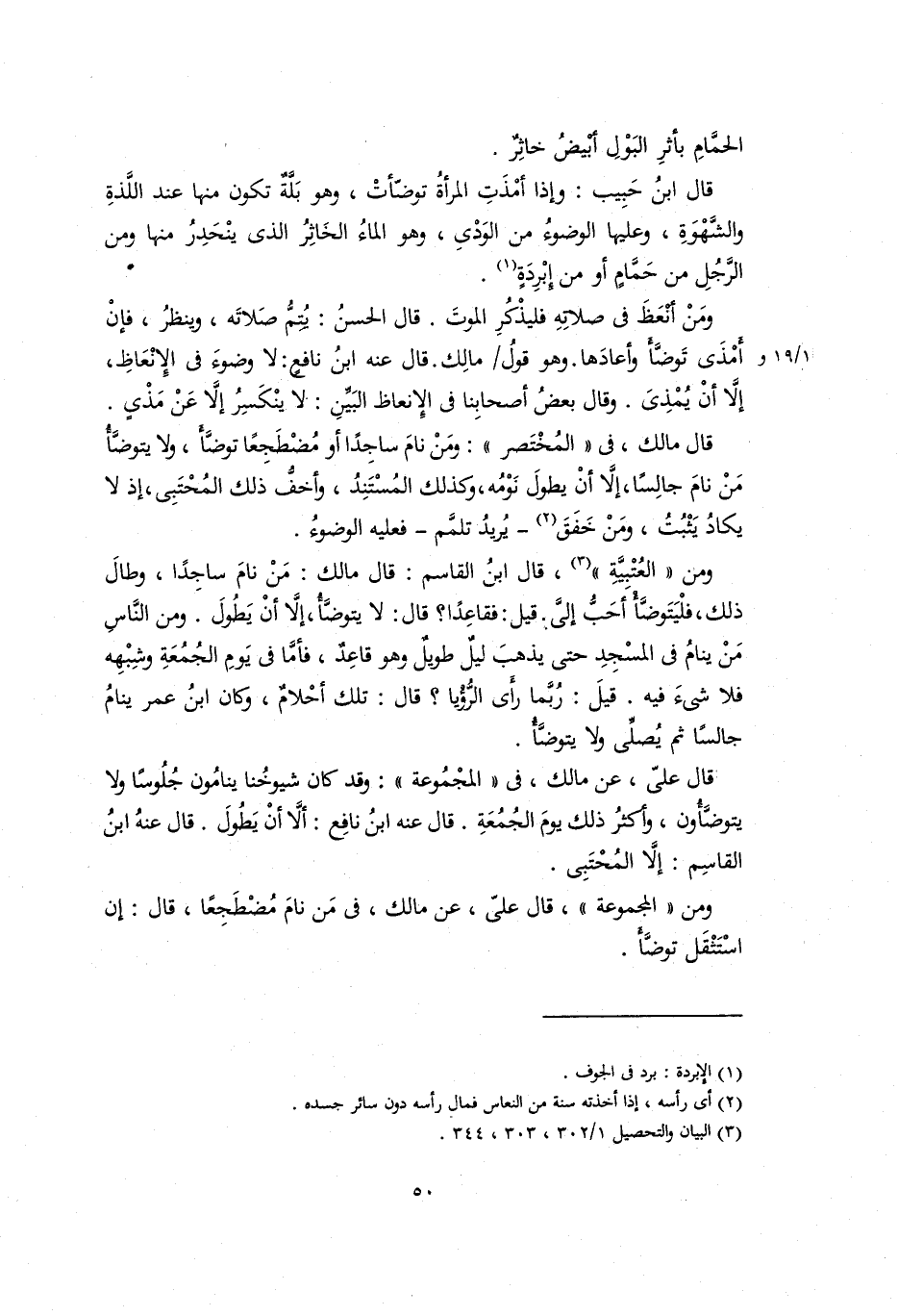 قال عليٌّ، عن مالك في المجموعة: وقد كان شيوخنا ينامون جلوسًا ولا يتَوَضَّئون، وأكثر ذلك يوم الجمعة. قال عنه ابن نافع: إلاَّ أن يطول. قال عنه ابن القاسم: إلاَّ المحتبي.