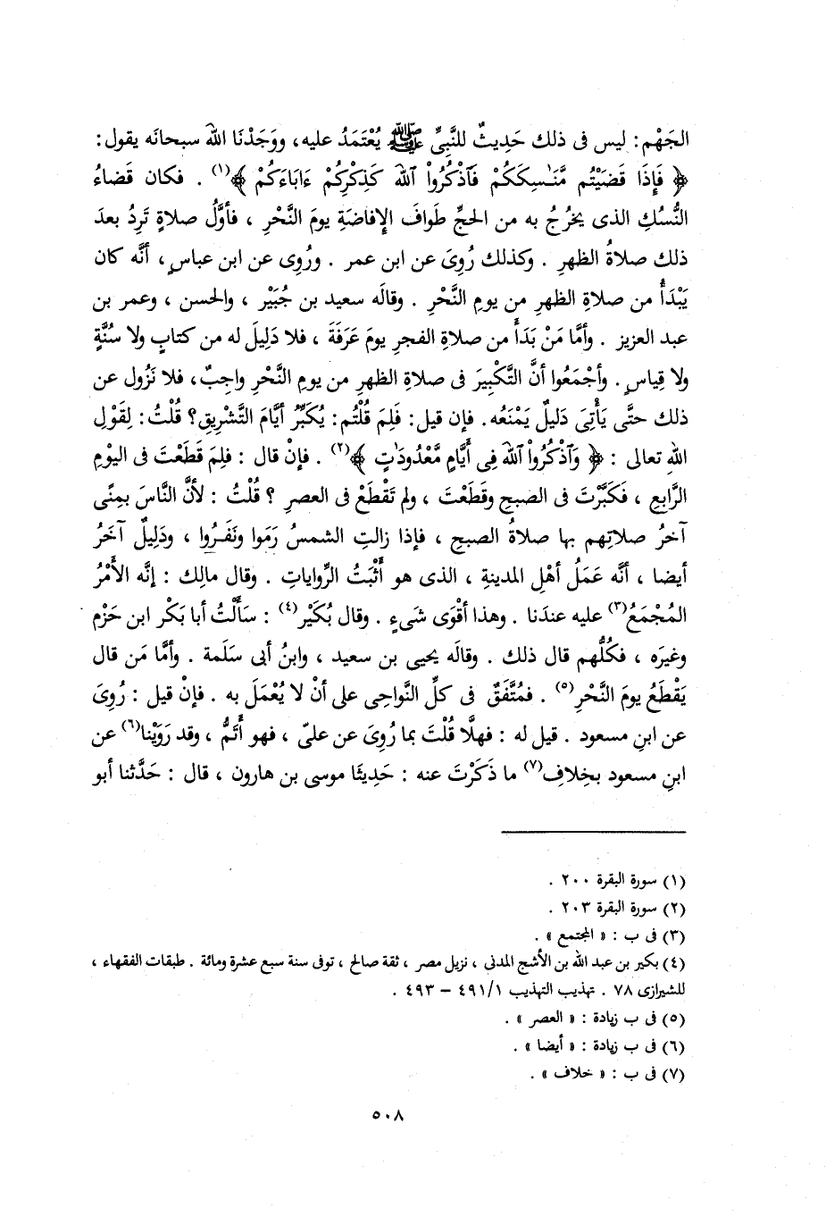 الجهم: ليس في ذلك حديث للنبي صلى الله عليه وسلم يعتمد عليه، ووجدنا الله سبحانه يقول: {فَإِذَا قَضَيْتُمْ مَنَاسِكَكُمْ فَاذْكُرُوا اللَّهَ كَذِكْرِكُمْ آَبَاءَكُمْ} (البقرة: 200). فكان قضاء النسك الذي يخرج به من الحج طواف الإفاضة يوم النحر، فأول صلاة ترد بعد ذلك صلاة الظهر. وكذلك روى عن ابن عمر. وَرَوَى عن ابن عباس، أنه كان يبدأ من صلاة الظهر من يوم النحر. وقاله سعيد بن جبير، والحسن، وعمر بن عبد العزيز. وأما من بدأ من صلاة الفجر يوم عرفه، فلا دليل له من كتاب ولا سنة ولا قياس. وأجمعوا أن التكبير في صلاة الظهر من يوم النحر واجب، فلا نزول عن ذلك حتى يأتي دليل يمنعه. فإن قيل: فلم قلتم: يكبر أيام التشريق؟ قلت: لقول الله تعالى: {وَاذْكُرُوا اللَّهَ فِي أَيَّامٍ مَعْدُودَاتٍ} (البقرة: 203). فإن قال: فلم قطعت في اليوم الرابع، فكبرت في الصبح وقطعت، ولم تقطع في العصر؟ قلت: لأن الناس بمنى آخر صلاتهم بها صلاة الصبح، فإذا زالت الشمس رموا ونفروا، ودليل آخر أَيْضًا، أنه عمل أهل المدينة، الذي هو أثبت الروايات. وقال مالك: إنه الأمر المجمع عليه عندنا. وهذا أقوى شيء. وقال بكير: سألت أبا بكر بن حزم وغيره، فكلهم قال ذلك. وقال يحيى بن سعيد، وابن أبي سلمة: وأما من قال يقطع يوم النحر. فمتفق في كل النواحي على أن لا يعمل به. فإن قيل: روى عن ابن مسعود. قيل له: فهلا قلت بما روى عن علي، فهو أتم، وقد روينا عن ابن مسعود بخلاف ما ذكرت عنه: حديثا موسى بن هارون، قال: حدثنا أبو