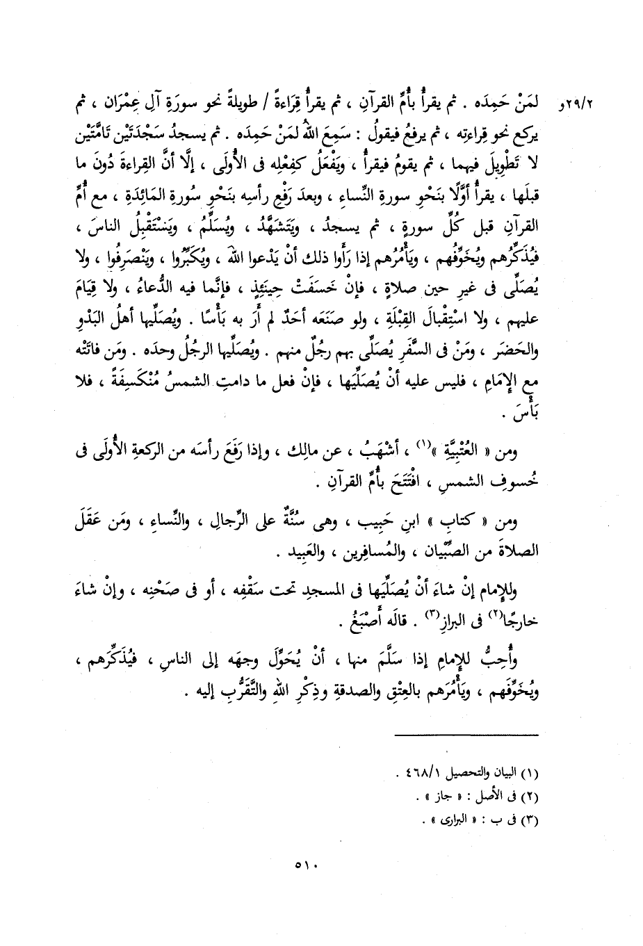 لمن حمده. ثم يقرأ بأم القرآن، ثم يقرأ قراءة طويلة نحو سورة آل عمران، ثم يركع نحو قراءته، ثم يرفع فيقول: سمع الله لمن حمده. ثم يسجد سجدتين تامتين لا تطويل فيهما، ثم يقوم فيقرأ، ويفعل كفعله في الأولى، إلاَّ أن القراءة دون ما قبلها، يقرأ أولا بنحو سورة النساء، وبع رفع رأسه بنحو سورة المائدة، مع أم القرآن قبل كل سورة، ثم يسجد، ويتشهد، ويسلم، ويستقبل الناس، فيذكرهم ويخوفهم، ويأمرهم إذا رأوا ذلك أن يدعوا الله، ويكبروا، وينصرفوا، ولا يصلي في غير حين الصلاة، فإن خسفت، فإنما فيه الدعاء، ولا قيام عليهم، ولا استقبال القبلة، ولو صنعه أحد لم أر به بأسا. ويصليها أهل البدو والحضر، ومن في السفر يصلي بهم رجل منهم. ويصليها رجل وحده. ومن فاتته مع الإمام، فليس عليه أن يصليها، فإن فعل ما دامت الشمس منكسفة، فلا بَأْسَ.