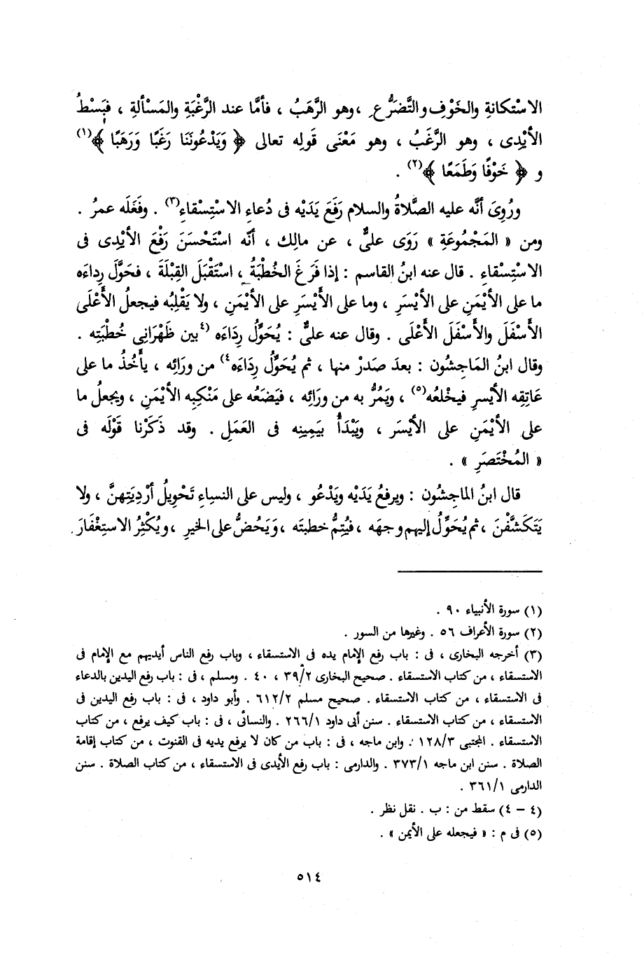 الاستكانة والخوف والتضرع، وهو الرهب، فأما عند الرغبة والمسألة، فبسط الأيدي، وهو الرغب، وهو معنى قول تعالى: {وَيَدْعُونَنَا رَغَبًا وَرَهَبًا} (الأنبياء: 90) و {خَوْفًا وَطَمَعًا} (السجدة: 16).