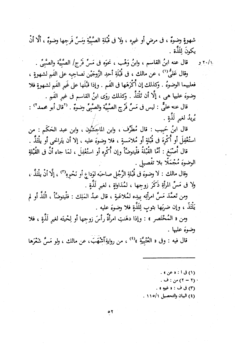 شهوة وضوءٌ، في مرض أو غيره، ولا في قبلة الصبية ومَسِّ فرجها وضوء، إلاَّ أن يكون للذة.