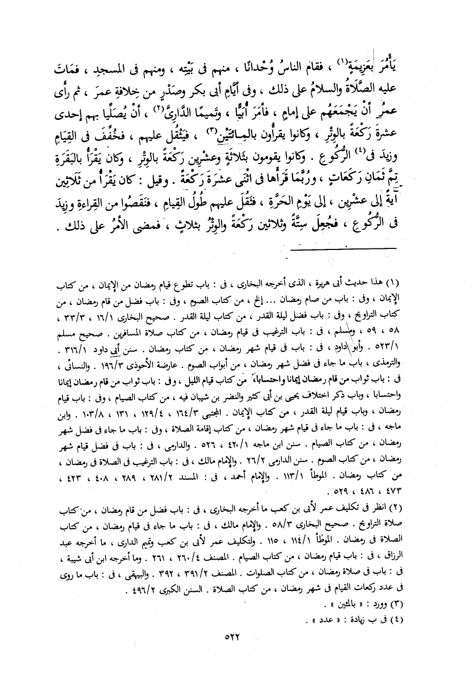 يأمر بعزيمة، فقام الناس وحدانا، منهم في بيته، ومنهم في المسجد، فمات عليه الصلاة والسلام على ذلك، وفي أيام أبي بكر وصدر من خلافة عمر، ثم رأى عمر أن يجمعهم على إمام، فأمر أبيًّا، وتميمًا الداري، أن يصليا بهم إحدى عشرة ركعة بالوتر، وكانوا يقرأون بالمائتين، فيثقل عليهم، فخفف في القيام وزيد في الركوع. وكانوا يقومون بثلاثة وعشرون ركعة بالوتر، وكان يقرأ بالبقرة تم ثمان ركعات، وربما قرأها في اثنى عشرة ركعة. وقيل: كان يقرأ من ثلاثين آية إلى عشرين، إلى يوم الحرة، فثقل عليهم طول القيام، فنقصوا من القراءة وزيد في الركوع، فجعل ستة وثلاثين ركعة والوتر بثلاث، فمضى الأمر على ذلك.