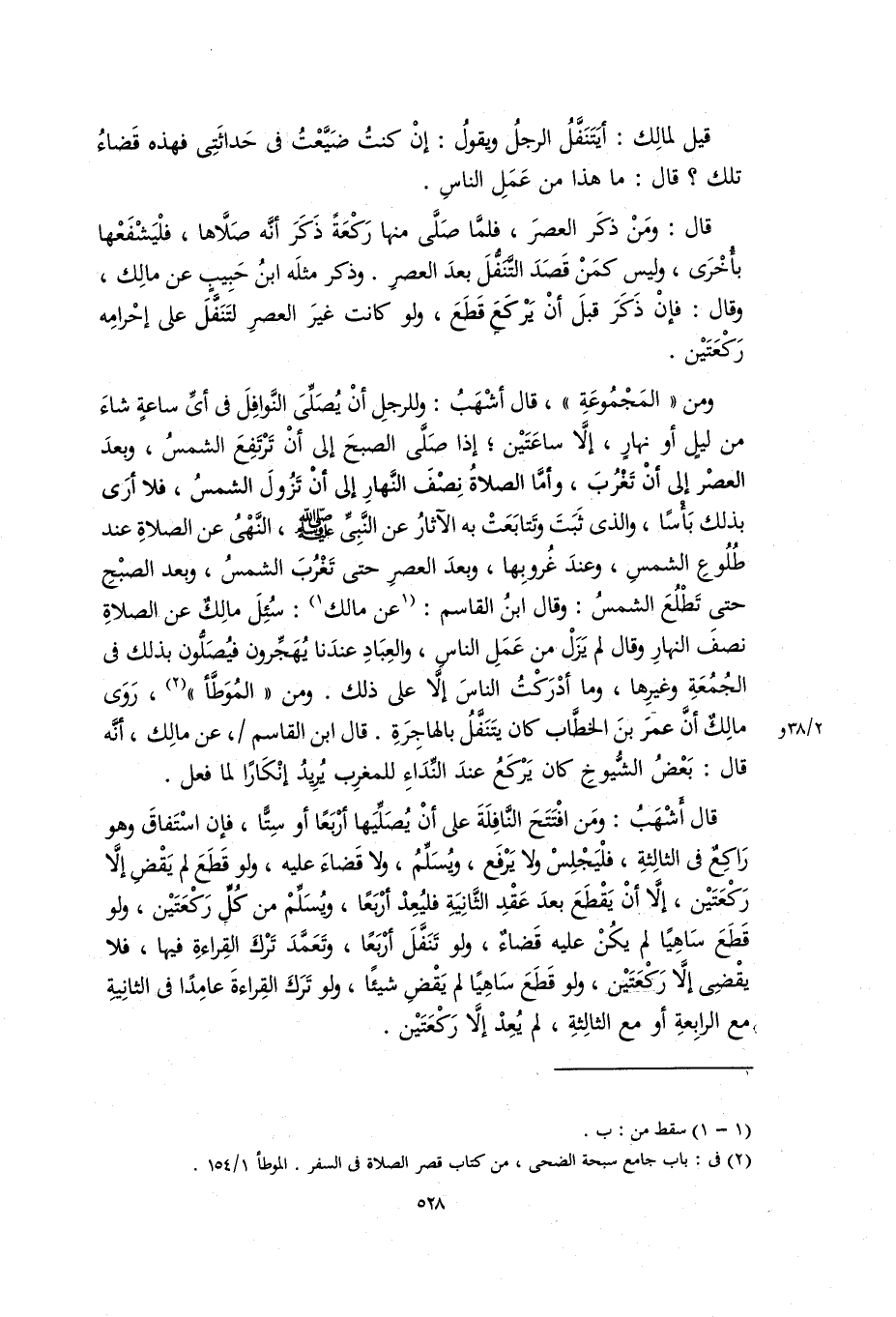 ومن (المجموعة)، قال أشهب: وللرجل أن يصلى النوافل في أي ساعة شاء من ليل أو نهار، إلاَّ ساعتين؛ إذا صلى الصبح إلى أن ترتفع الشمس، وبعد العصر إلى المغرب، وأما الصلاة نصف النهار إلى أن تزول الشمس، فلا أرى بذلك بأسا، والذي ثبت وتتابعت به الآثار عن النبي صلى الله عليه وسلم، النهي عن الصلاة عند طلوع الشمس، وعند غروبها، وبعد العصر حتى تغرب الشمس، وبعد الصبح حتى تطلع الشمس: وقال ابن القاسم: عن مالك: سئل مالك عن الصلاة نصف النهار وقال لم يزل من عمل الناس، والعباد عندنا يهجرون فيصلون بذلك في الجمعة وغيرها، وما ادركت الناس إلاَّ على ذلك. ومن (الموطأ)، روى مالك أن عمر بن الخطاب كان يتنفل بالهاجرة. قال ابن القاسم، عن مالك، أنه قال: بعض الشيوخ كان يركع عند النداء للمغرب يريد إنكارا لما فعل.