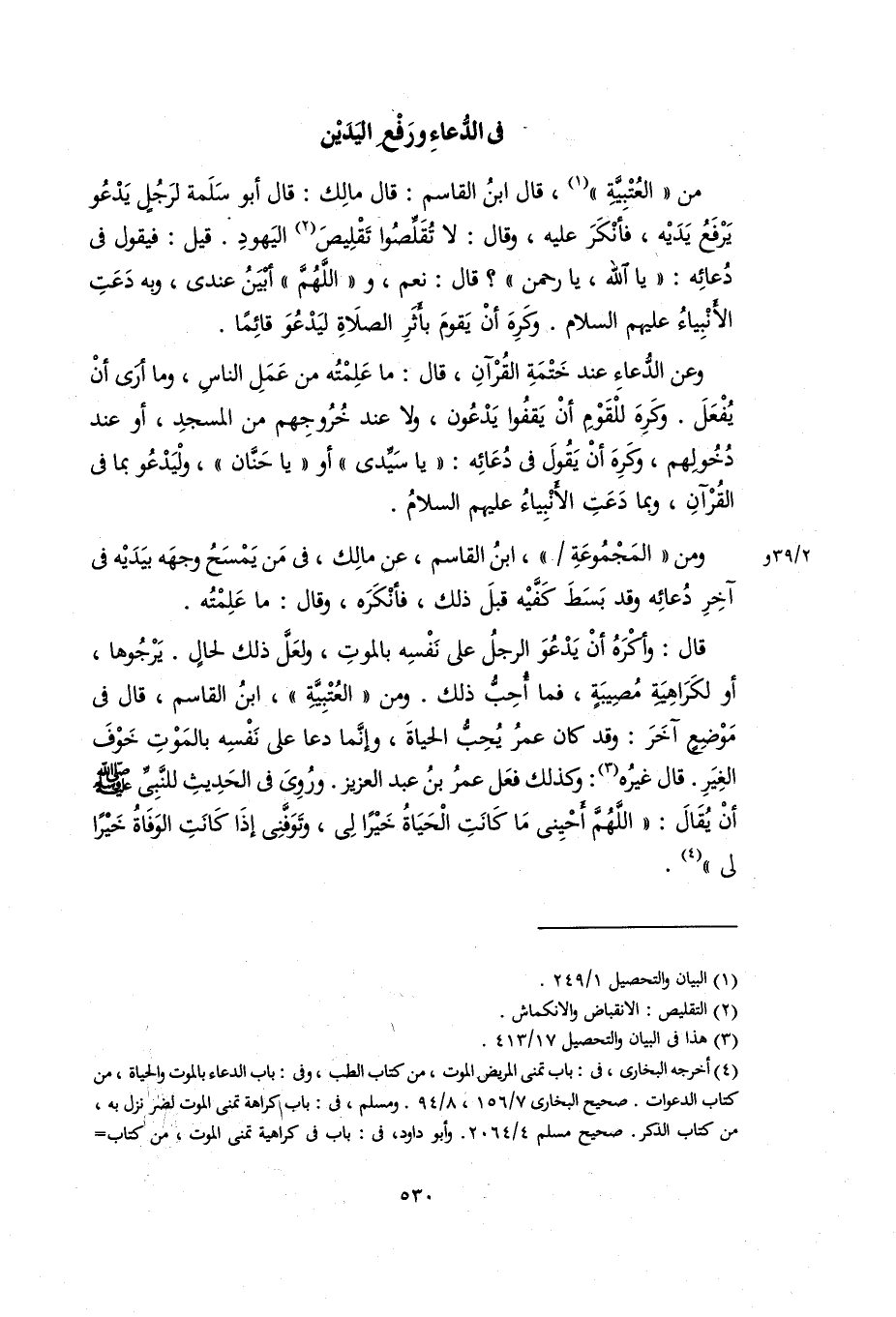 من (العتبية)، قال ابن القاسم: قال مالك: قال أبو سلمة لرجل يدعو يرفع يديه، فأنكر عليه، وقال: لا تقلصوا تقليص اليهود. قيل: فيقول في دعائه: (يألله، يا رحمن)؟ قال: نعم، و (اللهم) أبين عندي، وبه دعت الأنبياء عليهم السلام. وكره أن يقوم بأثر الصلاة ليدعو قائما.