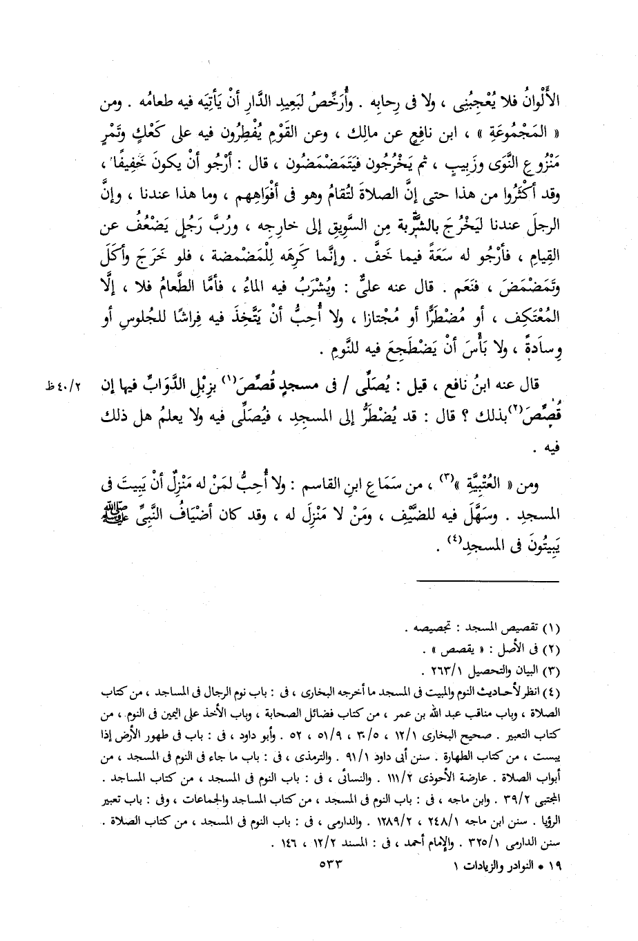 الألوان فلا يعجبني، ولا في رحابه. وأرخص لعبيد الدار أن يأتيه فيه طعامه. ومن (المجموعة)، ابن نافع عن مالك، وعم القوم يفطرون فيه على كعك وتمر منزوع النوى وزبيب، ثم يخرجون فيتمضمضون، قال: أرجو أن يكون خفيفا، وقد أكثروا من هذا حتى إن صلاة لتقام وهو في أفواههم، وما هذا عندنا، وإن الرجل عندنا ليخرج بالشربة من السويق إلى خارجه، ورب رجل يضعف عن القيام، فأرجو له سعة غيما خف. وإنما كرهه للمضمضة، غلو خرج وأكل وتمضمض، فنعم. قال عنه علي: ويشرب فيه الماء، فأما الطعام فلا، إلاَّ المعتكف، أو مضطرا أو مجتازا، ولا أحب أن يتخذ فيه فراشا للجلوس أو وسادة، ولا بَأْسَ أَنْ يضطجع فيه للنوم.