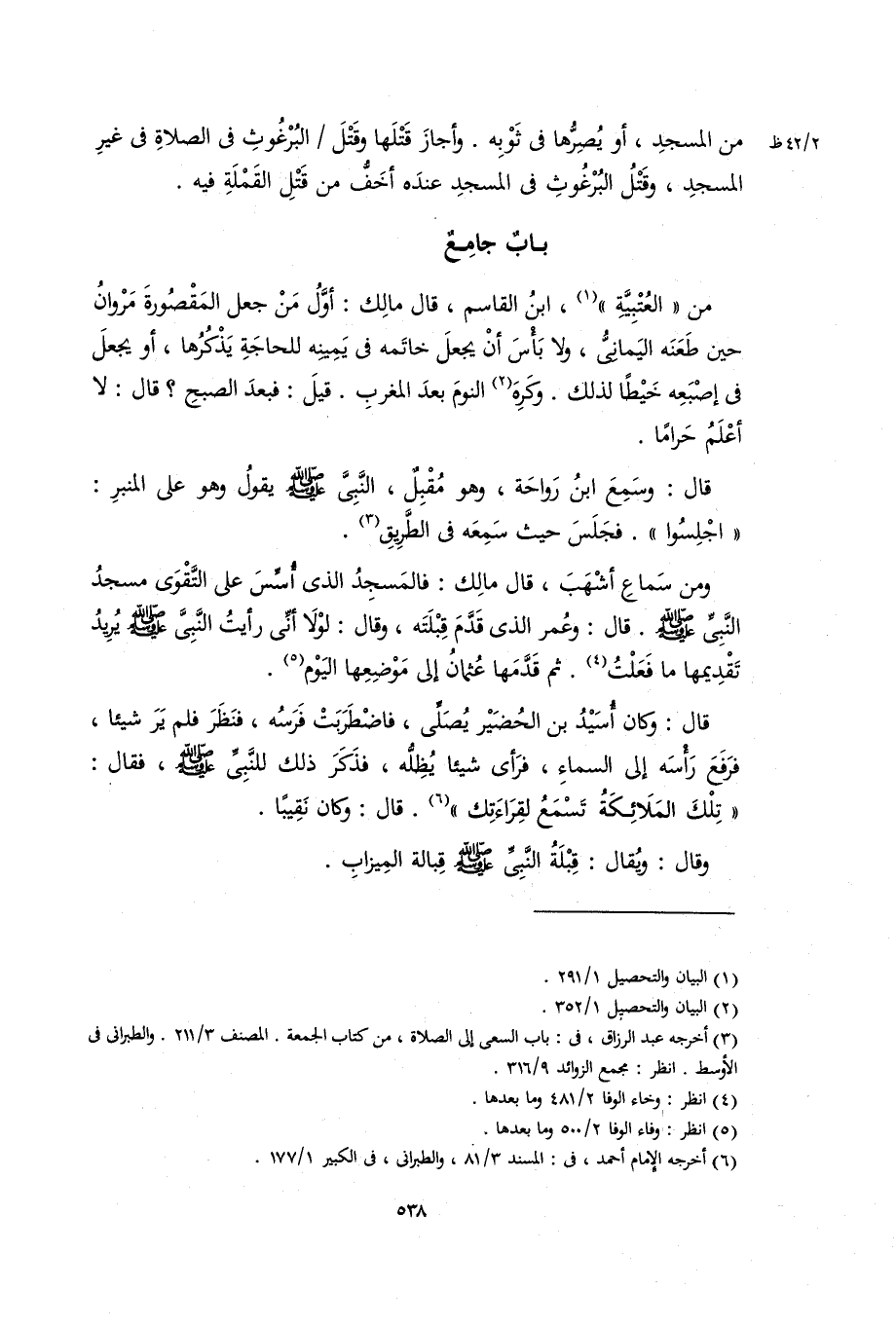 ومن سماع أشهب، قال مالك: فالمسجد الذي أسس على التقوى مسجد النبي صلى الله عليه وسلم. قال: وعمر الذي قدم قبلته، وقال: لولا أنى رأيت النبي صلى الله عليه وسلم يريد تقديمها ما فعلت. ثم قدمها عثمان إلى موضعها اليوم.