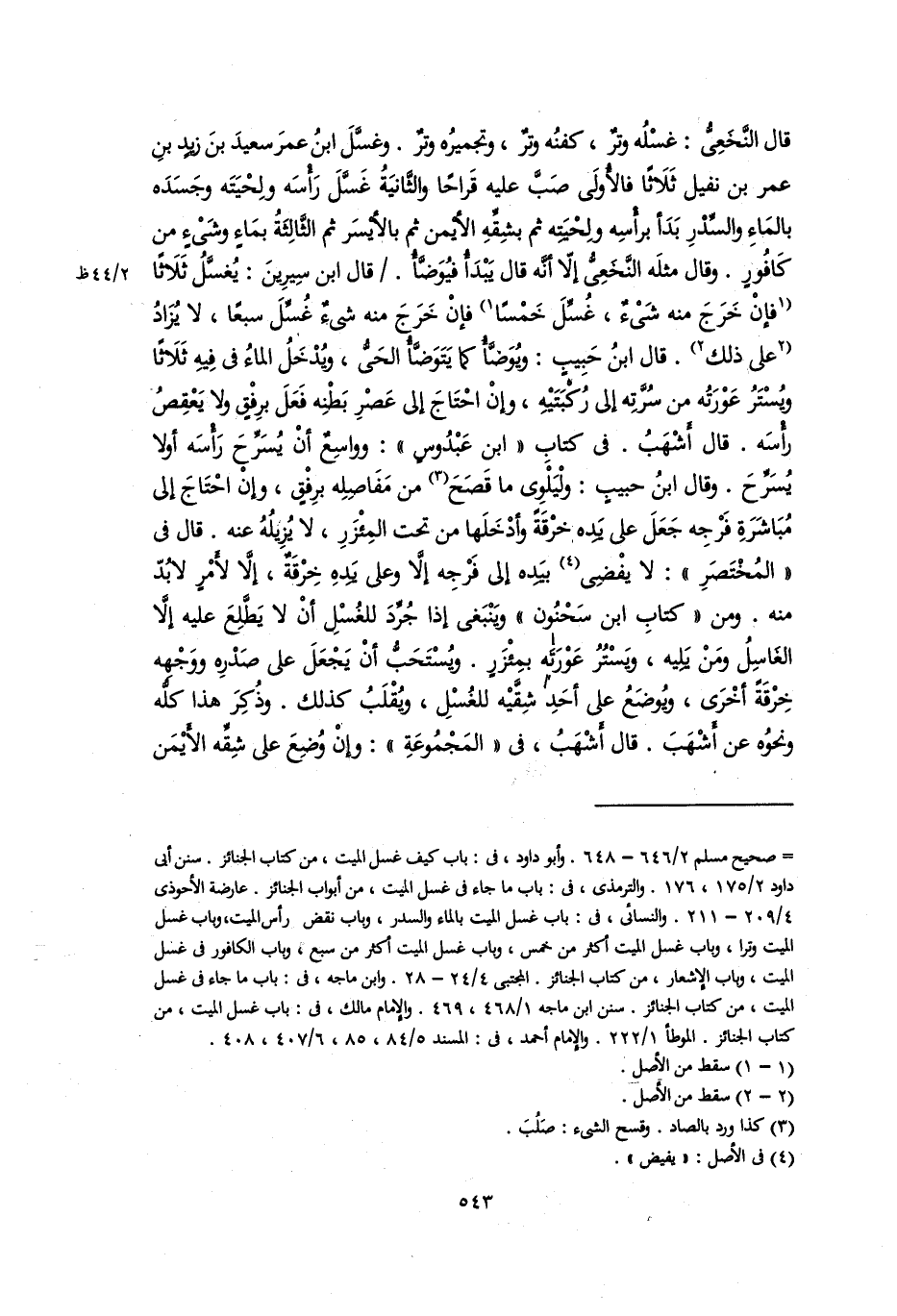 قال النخعي: غسله وتر، كفنه وتر، وتجميره وتر، وغسل ابن عمر سعيد بن زيد بن عمر بن نفيل ثلاثًا فالأولي صب عليه قراحًا والثانية غسل رأسه ولحيته وجسده بالماء والسدر بدأ برأسه ولحيته ثم بسقه الأيمن ثم بالأيسر ثم الثالثة بماء وشيء من كافور. وقال مثله النخعي إلاَّ أنه قال: يبدأ فيوضأ. قال ابن سيرين: يغسل ثلاثا فإن خرج منه شيء، غسل خمسا فإن خرج منه شيء غسل سبعا، لا يزاد على ذلك. قَالَ ابْنُ حَبِيبٍ: ويوضأ كما يتوضأ الحي، ويدخل الماء في فيه ثلاثا ويستر عورته من سرته إلى ركبتيه، وإن احتاج إلى عصر بطنه فعل برفق ولا يعقص رأسه. قال أشهب. في كتاب (ابن عبدوس): وواسع أن يسرح رأسه أَوَّلاً يسرح. قَالَ ابْنُ حَبِيبٍ: وليلوى ماقصح من مفاصله برفق، وإن احتاج إلى مباشرة فرجه جعل على يديه خرقه وأدخلها من تحت المئزر، لا يزيله عنه. قال في (المختصر): لا يفضى بيده إلى فرجه إلاَّ وعلى يده خرقة، إلاَّ لأمر لابد منه. ومن (كتاب ابن سحنون) وينبغي إذا جرد للغسل أن لا يطلع عليه إلاَّ الغاسل ومن يليه، ويستر عورته بمئزر. ويستحب أن يجعل على صدره ووجهه خرقة أخرى، ويوضع على أحد شقيه للغسل، ويقلب كذلك. وذكر هذا كله ونحوه عن أشهب. قال أشهب، في (المجموعة): وإن وضع على شقه الأيمن