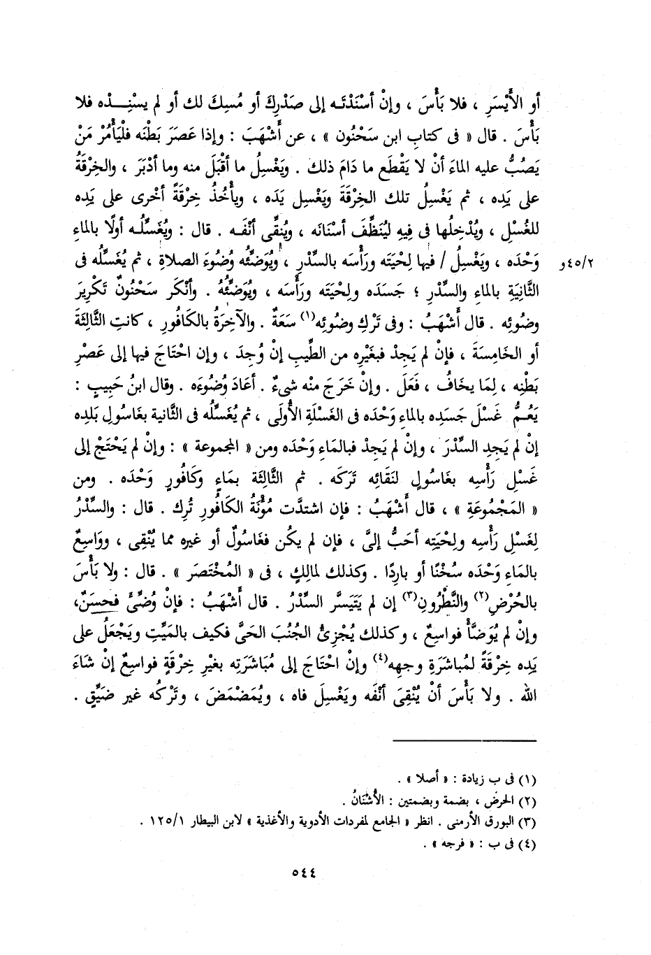 أو الأيسر، فلا بَأْسَ، وإن أسندته صدرك أو مسك لك أو لم يسنده فلا بَأْسَ. قال (في كتاب ابن سحنون)، عن أشهب: وإذا عصر بطنه فليأمر من يصب عليه الماء أن لا يقطع مدام ذلك. ويغسل ما أقبل منه وما أدبر، والخرقة على يده، ثم يغسل تلك الخرقة ويغسل يده، ويأخذ خرقة أخرى على يده للغسل، ويدخاها في فيه لينظف أسنانه، وينقي أنفه. قال: ويغسله أولا بالماء وحده، ويغسل فيها لحيته ورأسه بالسدر، ويوضئه وضوء الصلاة، ثم يغسله في الثانية بالماء والسدر؛ جسده ولحيته ورأسه، ويوضئه. وأنكر سحنون تكرير وضوئه. قال أشهب: وفي ترك ووئه سعة. والآخرة بالكافور، كانت الثالثة أو الخامسة، فإن لم يجد فبغيره من الطيب إن وجد، وإن احتاج فيها إلى عصر بطنه، لما يخاف، فعل. وإن خرج منه شيء. أعاد وضوئه. وقَالَ ابْنُ حَبِيبٍ: يعم غسل جسده بالماء وحده في الغسلة الأولى، ثم يغسله في الثانية بغاسول بلده إن لم يجد السدر، وإن لم يجد فبالماء وحده ومن (المجموعة): وإن لم يحتج إلى غسل رأسه بغاسول لنقائه تركه. ثم الثالثة بماء وكافور وحده. ومن (المجموعة)، قال أشهب: فإن اشتدت مؤنه الكافور ترك. قال: والدر لغسل رأسه ولحيته أحب إلى، فإن لم يكن فغاسول أو غيره مما ينقى، وواسع بالماء وجده سخنا أو باردا. وكذلك لمالك، في (المختصر). قال: ولا بَأْسَ بالحرض والنطرون إن لم يتيسر السدر. قال أشهب: فإن وضى فحسن، وإن لم يوضأ فواسع، وكذلك يجزى الجنب الحى فكيف بالميت ويجعل على يده خرقة لمباشرة وجهه وإن احتاج إلى مباشرته بغير خرقة فواسع إن شاء الله. ولا بَأْسَ أَنْ ينقى أنفه ويغسل وفاه، ويمضمض، وتركه غير ضيق.