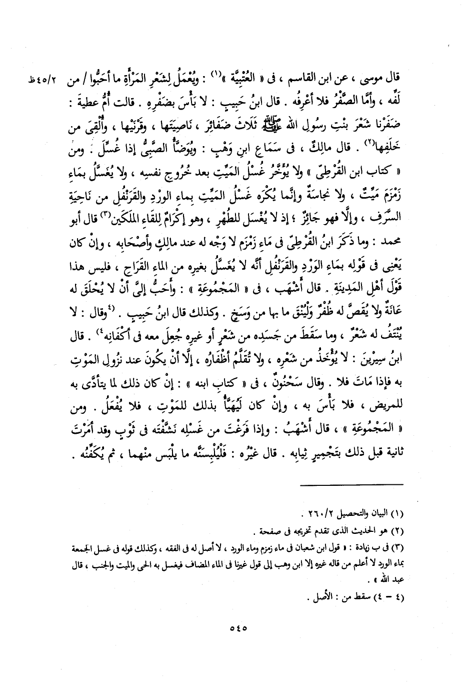 قال موسى، عن ابن القاسم، في (العتبية): ويعمل لشعر المرأة ما أحبوا من لفه، وأما الصفر فلا أعرفه. قَالَ ابْنُ حَبِيبٍ: لا بَأْسَ بضفره. قالت أم عطية: ضفرنا شعر بنت رسول الله صلى الله عليه وسلم ثلاث ضفائر، ناصيتها، وقرنيها، وألقي من خلفها. قال مالك، في سماع ابن وهب: ويوضأ الصبي إذا غسل. ومن (كتاب ابن القرطي) ولا يؤخر غسل الميت بعد خروج نفسه، ولا يغسل بماء زمزم ميت، ولا نجاسه وإنما يكره غسل الميت بماء الورد والقرنفل من ناحية السرف، وإلاَّ فهو جائز؛ إذ لم يغسل للطهر، وهو إكرام للقاء الملكين قال أبو محمد: وما ذكر ابن القرطي في ماء زمزم لا وحه له عند مالك وأصحابه، وإن كان يعني في قوله بماء الورد والقرنفل أنه لا يغسل بغيره من الماء القراح، فليس هذا قول أهل المدينة. قال أشهب، في (المجموعة): وأَحَبُّ إليَّ أن لا يحلق له عانه أو يقص له ظفر ولينق ما بها من وسخ. وكذلك قَالَ ابْنُ حَبِيبٍ. وقال: لا ينتف له شعر، وما سقط من جسده من شعر أو غيره جعل معه في أكفانه. قال ابن سيرين: لا يؤخذ منه شعر، ولا تقلم أظفاره، إلاَّ أن يكون عند نزول الموت به فإذا مات فلا. وقال سحنون، في (كتاب ابنه): إن كان ذلك يتأدى به للمريض، فلا بَأْسَ به، وإن كان ليهيأ بذلك للموت، فلا يفعل. ومن (المجموعة)، قال أشهب: وإذا فرغت من غسله نشفته في ثوب وقد أمرت ثانية بل ذلك بتجمير ثيابه. قال غيه: فليلبسنه ما يلبس منهما، ثم يكفنه.