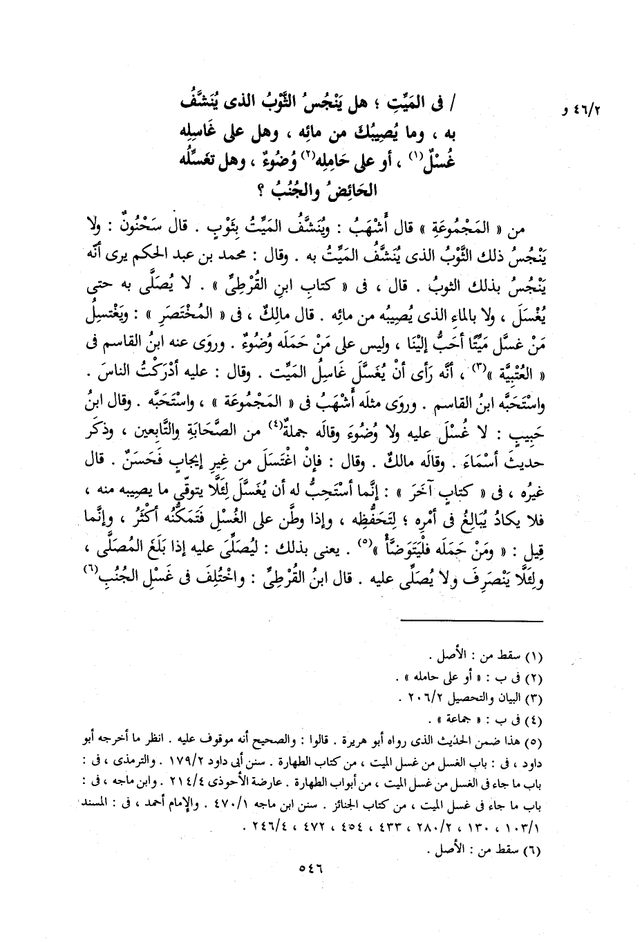 من (المجموعة) قال أشهب: وينشف الميت بثوب. قال سحنون: ولا ينجس ذلك الثوب الذي ينشف الميت به. وقال: محمد بن عبد الحكم يرى أنه ينجس بذلك الثوب. قال، في (كتاب ابن القرطي). لا يصلى به حتى يغسل، ولا بالماء الذي يصيبه من مائه. قال مالك، في (المختصر): ويغتسل من غسل ميتا أحب إلينا، وليس عَلَى مَنْ حمله وضوء. وَرَوَى عنه ابن القاسم في (العتبية)، أنه رأى أن يغسل غاسل الميت. وقال: عليه ادركت الناس. واستحبه ابن القاسم. وَرَوَى مثله أشهب في (المجموعة)، وأستحبه. وقَالَ ابْنُ حَبِيبٍ: لا غسل عليه ولا وضوء وقاله جملة من الصحابة والتابعين، وذكر حديث أسماء. وقاله مالك. وقال: فإن اغتسل من غير إيجاب فحسن. قال غيره، في (كتاب آخر): إنما أستحب له أن يغسل لئلا يتوقي ما يصيبه منه، فلا يكاد يبالغ في أمره؛ لتحفظه، وإذا وطن على الغسل فتمكنه أكثر، وإنما قيل: (ومن حمله فليتوضأ). يعني بذلك: ليصلى عليه إذا بلغ المصلى، ولئلا ينصرف ولا يصلي عليه. قال ابن القرطي: واختلف في غسل الجنب