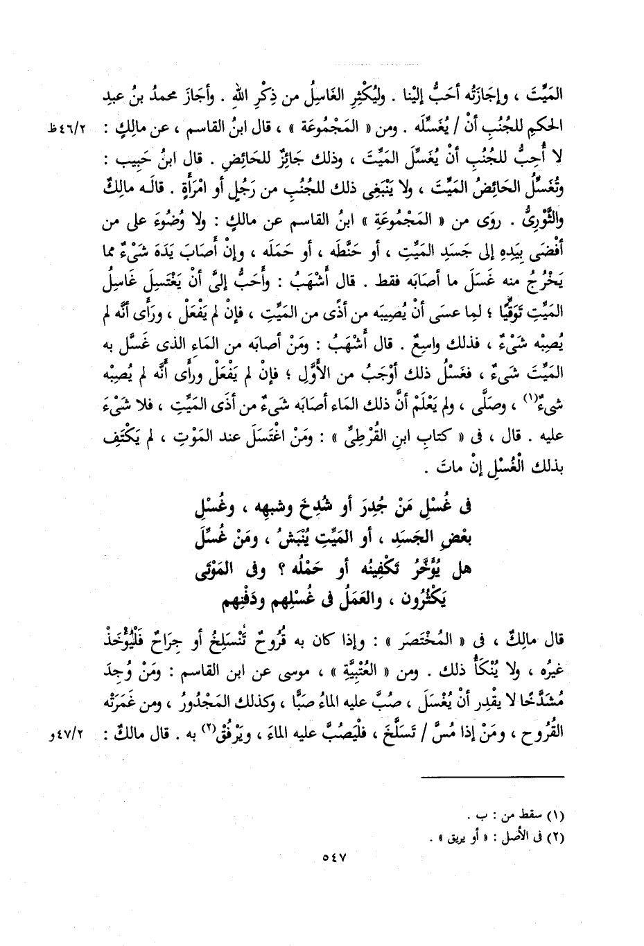 الميت، وإجازته أحب إلينا. وليكثر الغاسل من ذكر الله. وأجاز محمد بن عبد الحكم للجنب أن يغسله. ومن (المجموعة)، قال ابن القاسم، عن مالك: لا أحب للجنب أن يغسل الميت، وذلك جائز للحائض. قَالَ ابْنُ حَبِيبٍ: وتغسل الحائض الميت، ولا ينبغي ذلك للجنب من رجل أو امرأة. قاله مالك والثورى. روى من (المجموعة) ابن القاسم عن مالك: ولا وضوء عَلَى مَنْ أفضى بيده إلى جسد الميت، أو حنطه، أو حلمه، وإن أصاب يده شيء مما يخرج منه غسل ما أصابه فقط. قال أشهب: وأَحَبُّ إليَّ أن يغتسل غاسل الميت توقيا؛ لما عسى أن يصيبه من أذى من الميت، فإن لم يفعل، ورأى أنه لم يصبه شيء، فذلك واسع. قال أشهب: ومن أصابه من الماء الذي غسل به الميت شيء، فغسل ذلك أوجب من الأول؛ فإن لم يفعل ورأى أنه لم يصبه شيء، وصَلَّى، ولم يعلم أن ذلك الماء أصابه شيء من أذى الميت، فلا شيء عليه. قال، في (كتاب ابن القرطي): ومن اغتسل عند الموت، لم يكتف بذلك الغسل إن مات في غسل من جدر أو شدخ وشبهه، وغسل بعض الجسد، أو الميت ينبش، ومن غسل هل يؤخر تكفينه أو حمله؟ وفي الموتى يكثرون، والعمل في غسلهم ودفنهم