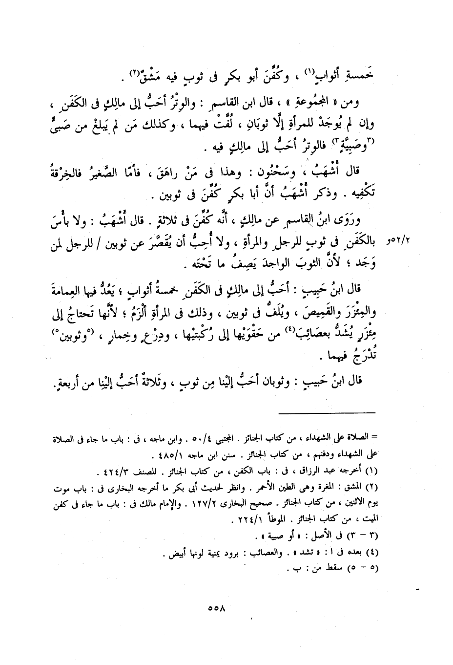 قَالَ ابْنُ حَبِيبٍ: أَحَبُّ إليَّ مال في الكفن خمسة أثواب؛ يعد فيها العمامة والمئزر والقمص، ويلف في ثوبين، وذلك في المرأة ألزم؛ لأنها تحتاج إلى مئزر يشد بعصائب من حقويها إلى ركبتيها، ودرع وخمار، وثوبين تدرج فيهما.