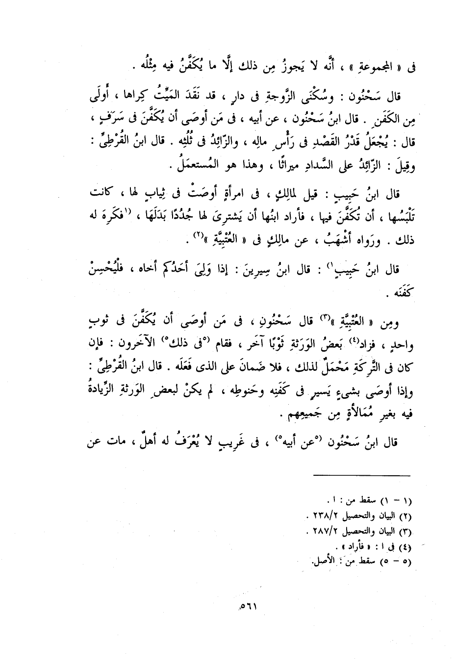 قَالَ ابْنُ حَبِيبٍ: قيل لمالك، في امرأة أوصت في ثياب لها، كانت تلبسها، أن تكفن فيها، فأراد ابنها أن يشترى لها جددا بدلها، فكره له ذلك. ورواه أشهب، عن مالك في (العتبية).