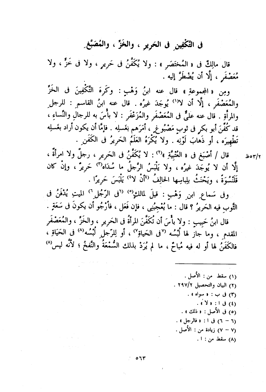 ومن (المجموعة) قال عنه ابن وهب: وكره التكفين في الخز والمعصفر، إلاَّ أن لا يوجد غيره. قال ابن القاسم: للرجل والمرأة. قال عنه علي في المعصفر والمزعفر: لا بَأْسَ به للرجل والنساء، قد كفن أبو بكر في ثوب مصبوغ، أمرهم بغسله. فإما أن يكون أراد بغسله تطهيره، أو ذهاب لونه. ولا يكره العلم الحرير في الكفن.