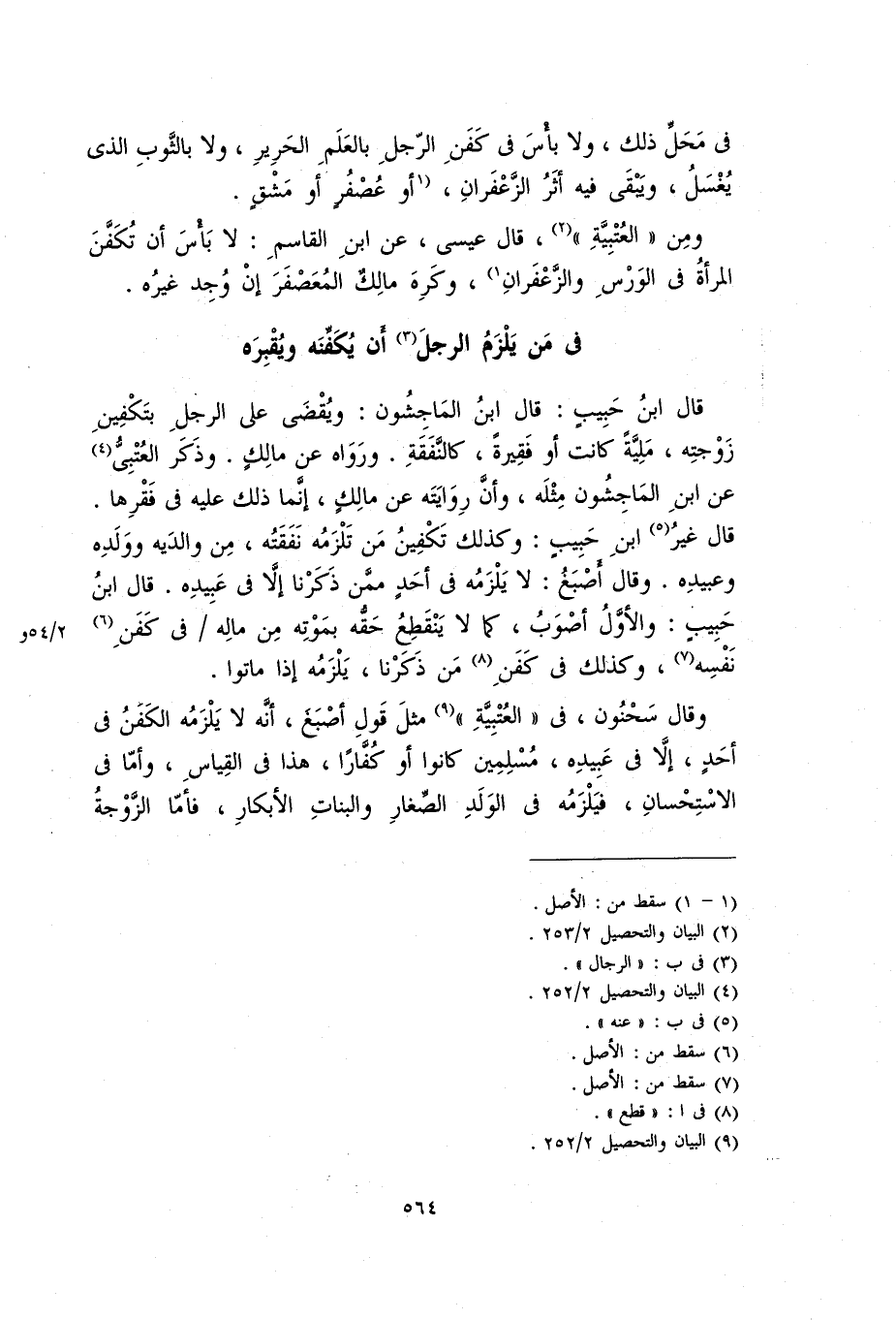 قال غير ابن حبيب: وكذلك تكفين من تلزمه نفقته، من والديه وولده وعبيده. وقال أصبغ: لا يلزمه في أحد ممن ذكرنا إلاَّ في عبيده. قَالَ ابْنُ حَبِيبٍ: والأول أصوب، كما لا نقطع حقه بموته من ماله في كفن نفسه، وكذلك في كفن من ذكرنا، يلزمه إذا ماتوا.