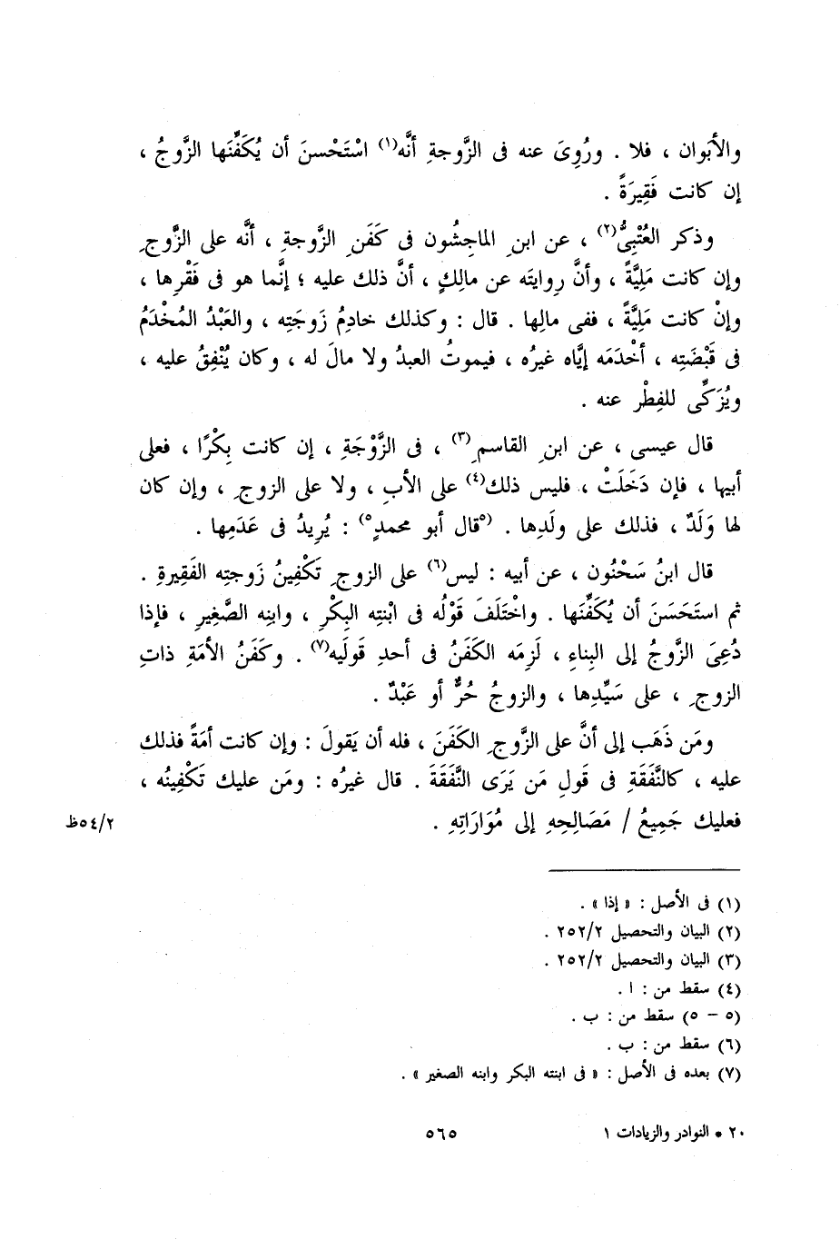 وذكر العتبي، عن ابن الماجشونفي كفن الزوجة، أنه على الزوج وإن كانت ملية، وأن روايته عن مالك، أن ذلك عليه؛ إنما هو في فقرها، وإن كانت ملية، ففي مالها. قال: وكذلك خادم زوجته، والعبد المخدم في قبضته، أخدم إياه غيره، فيموت العبد ولا مال له، وكان ينفق عليه، ويزكي للفطر عنه.