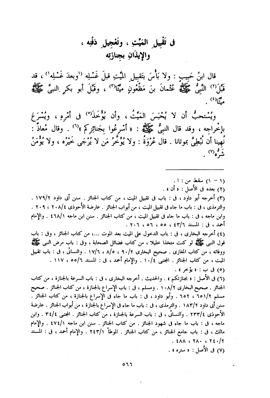 ويستحب أن لا يحبس الميت، وأن يوخذ في أمره، ويسرع خراجه، وقد قال النبي صلى الله عليه وسلم: «أسرعوا بجنائزكم». وقال معاذ: نهينا أن نبطي بموتانا. قال عروة: ولا يؤخر من لا يرجي خيره، ولا يؤمن شره.