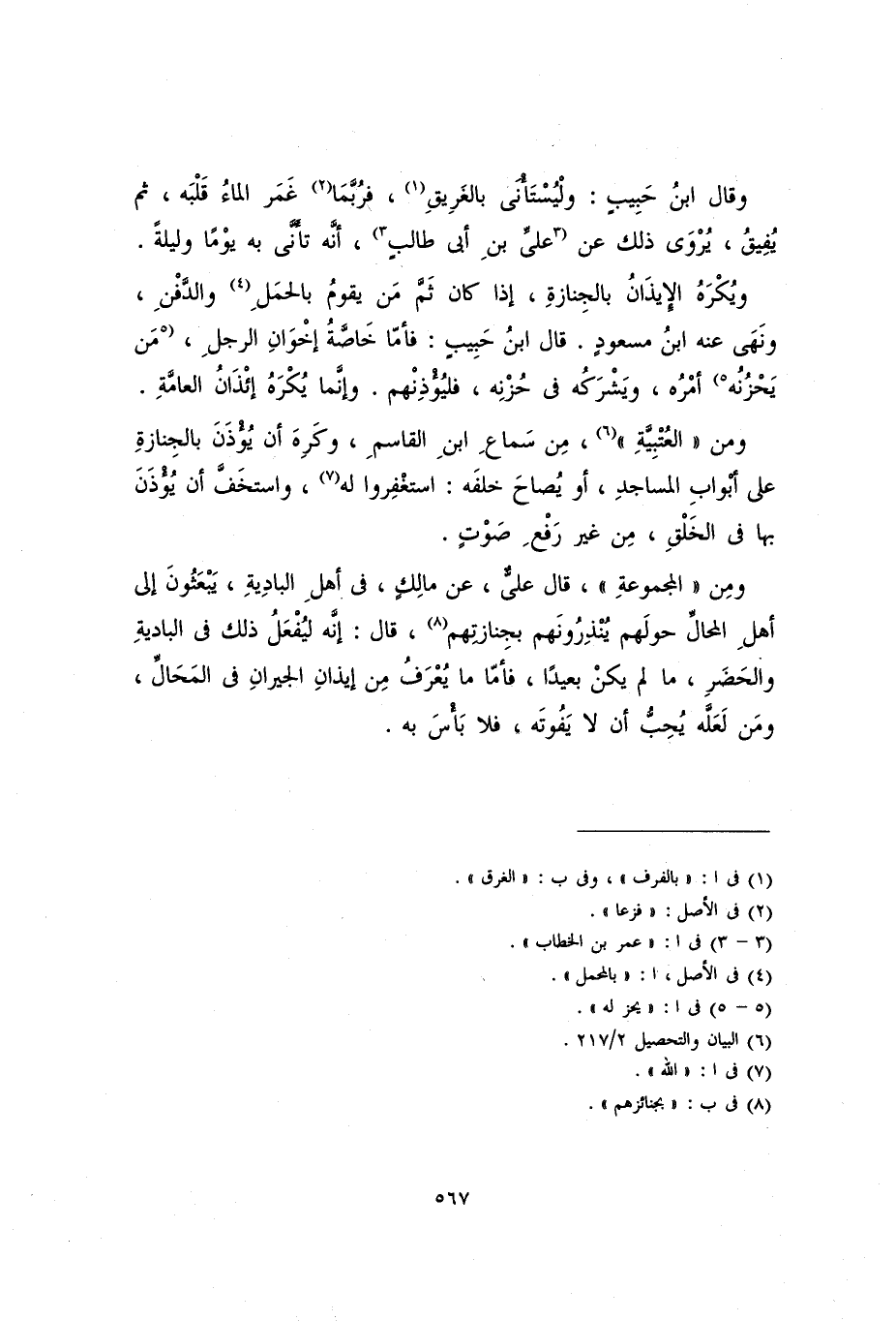 ومن (المجموعة)، قال علي، عن مالك، في أهل البادية، يبعثون إلى أهل المحال حولهم ينذرونهم، قال: إنه ليفعل ذلك في البادية والحضر، ما لم يكن بعيدا، فأما ما يعرف من إيذان الجيران في المحال، ومن لعله يحب أن لا يفوته، فلا بَأْسَ به.