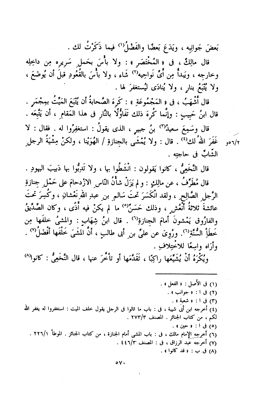 قال مُطَرِّف، عن مالك: ولم يزل شأن الناس الازدحام على حمل جنازة الرجل الصالح، ولقد انكسر تحت سالم بن عبد الله نعشان، وكسر تحت عائشة ثلاثة أنعش، وذلك حسن ما لم يكن فيه أذى، وكان الصديق والفاروق يمشون أمام الجنازة. قال ابن أشهب: والمشي خلفها من خطأ السنة. وَرَوَى عن علي بن أبي طالب، أن المشي خلفها أفضل. وأراه واسعا للاختلاف.