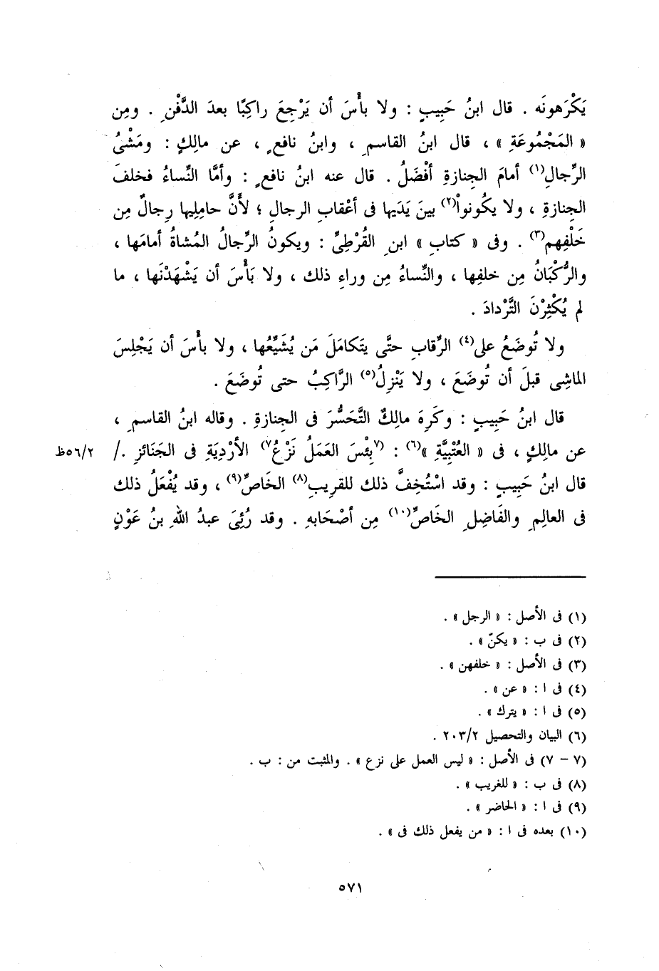يكرهون. قَالَ ابْنُ حَبِيبٍ: وَلا بَأْسَ أن يرجع راكبا بعد الدفن. ومن (المجموعة)، قال ابن القاسم، وابن نافع، عن مالك: ومشي الرجال أمام الجنازة أفضل. قال عنه ابن نافع: وأما النساء فخلف الجنازة، ولا يكونوا بين يديها في أعقاب الرجال؛ لأن حامليها رجال من خلفهم. وفي (كتاب) ابن القرطي: ويكون الرجال المشاة أمامها، والركبان من خلفها، والنساء من وراء ذلك أن يشهد نها، ما لم يكثرن الترداد.