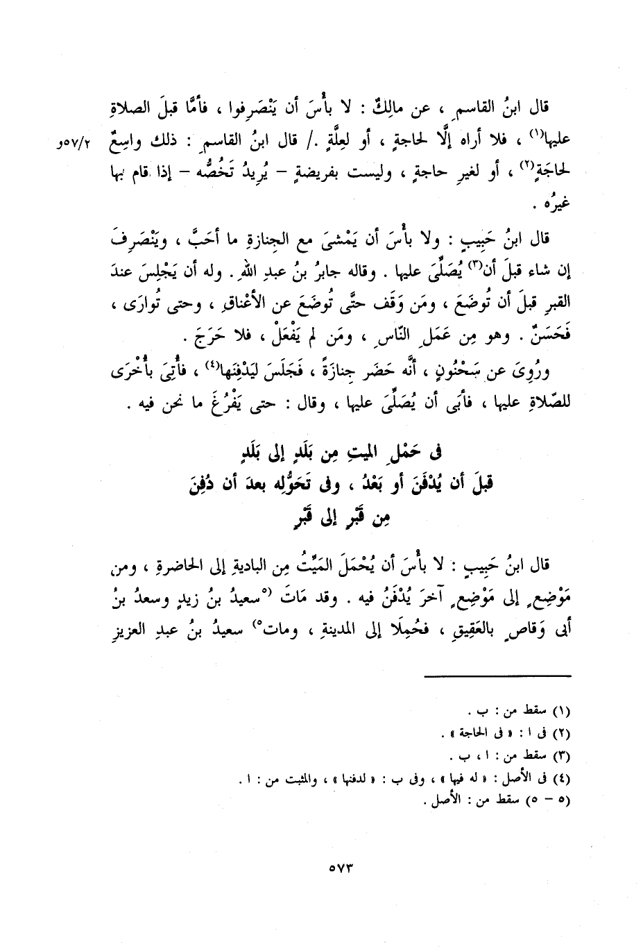 قَالَ ابْنُ حَبِيبٍ: لا بَأْسَ أَنْ يحمل الميت من البادية إلى الحاضرة، ومن موضع إلى موضع آخر يدفن فيه. وقد مات سعيد بن زيد وسعد بن أبي وقاص بالعقيق، فحملا إلى المدينة، ومات سعيد بن عبد العزيز