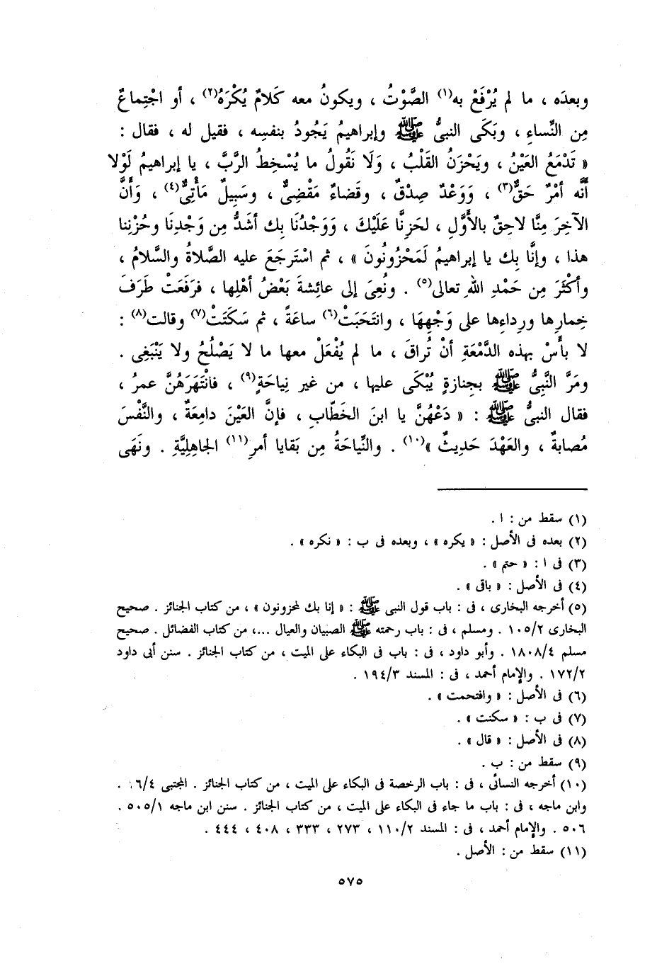وبعده، ما لم يرفع به الصوت، ويكون معه كلام يكره، أو اجتماع من النساء، وبكي النبي صلى الله عليه وسلم وإبراهيم يجود بنفسه، فقيل له، فقال: «تدمع العين، ويجزن القلب، ولا نقول ما يسخط الرب، يا إبراهيم لولا أنه أمر حق، ووعد صدق، وقضاء مقضي، وسبيل مأتي، وأن الآخر منا لاحق بالاول، لحزنا عليك، ووجدنا بك أشد من وجدنا وجزنا هذا، وإنا بك إبراهيم لمحزونون». ثم استرجع عليه الصلاة والسلام، وأكثر من حمد الله تعالي. ونعي إلى عائشة بعض أهلها، فرفعت طرف خمارها ورداءها على وجهها، وانتحبت ساعة، ثم سكتت وقالت: لا بَأْسَ بهذه الدمعة أن تراق، ما لم يفعل معها ما لا يصلح ولا ينبغي. ومر النبي صلى الله عليه وسلم بجنازة يبكي عليها، من غير نياحة، فانتهرهن عمر، فقال النبي صلى الله عليه وسلم: «دعهن يا ابن الخطاب، فإن العين دامعة، والنفس مصابة، والعهد حديث». والنياحة من بقايا أمر الجاهلية. ونهي