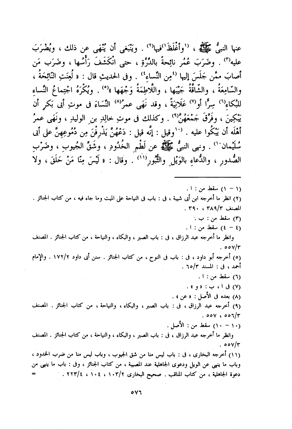 عنها النبي صلى الله عليه وسلم، وأغلظ فيها. وينبغي أن ينهي عن ذلك، ويضرب عليه. وضرب عمر نائحة بالدرة، حتى انكشف رأسها، وضرب من أصاب ممن جلس إليها من النساء. وفي الحديث قال: «لعنت النائحة، والسامعة، والشاقة جيبها، واللاطمة وجهها». ويطره اجتماع النساء للبكاء سرا أو علانية، وقد نهي عمر النساء في موت أبي بكر أن يبكين، وفرق جمعهن. وكذلك في موت خالد بن الوليد، ونهي عمر أهله أن يبكوا عليه. وقيل: إنه قيل: دعهن يذرفن من دموعهن على أبي سليمان. ونهى النبي صلى الله عليه وسلم عن لطم الخدود، وشق الجيوب، وضرب الصدور، والدعاء بالويل والثبور. وقال: «ليس منا من خلق، ولا