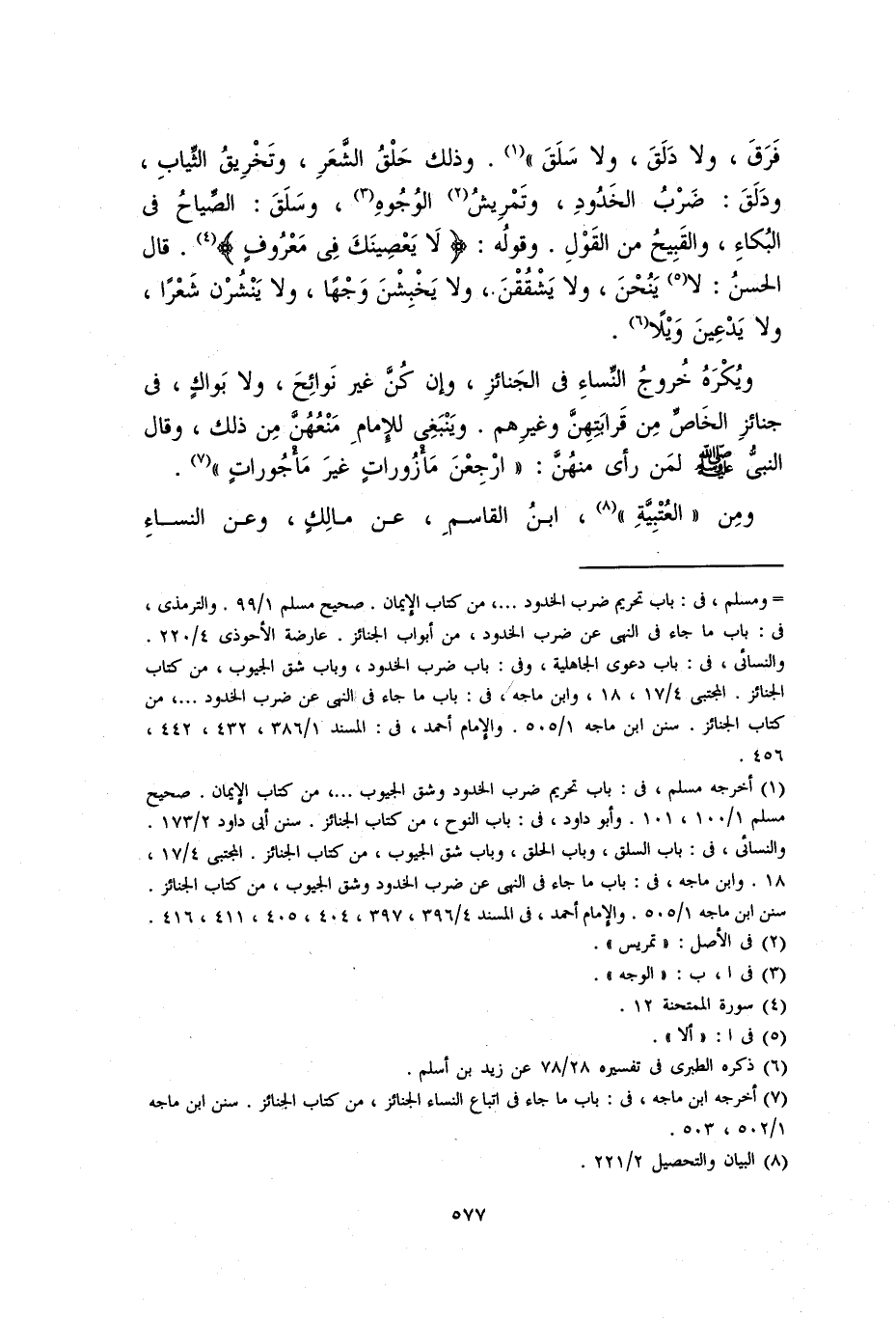 فرق، ولا دلق، ولا سلق». وذلك حلق الشعر، وتخريق الثياب، ودلق: ضرب الخدود، وتمريش الوجوه، وسلق: الصياح في البكاء، والقبيح من القول. وقوله: {وَلَا يَعْصِينَكَ فِي مَعْرُوفٍ} (الممتحنة: 12). قال الحسن: لا يَنُحْنَ، ولا يَشْقُقْنَ، ولا يَخْبِشْنَ وَجْهًا، ولا ينشرن شعرا، ولا يَدْعِينَ وَيْلاً.