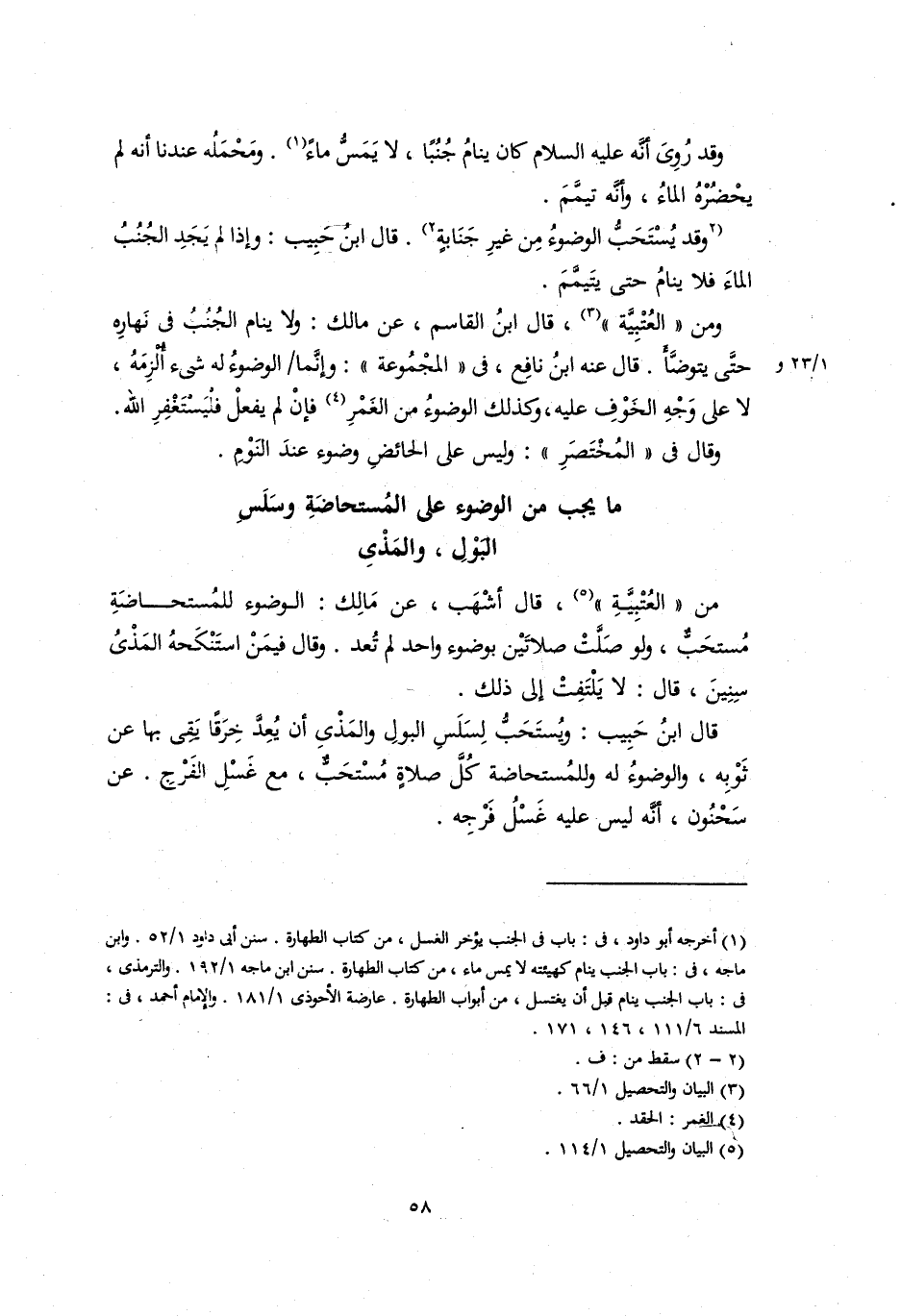 من العتبية، قال أشهب، عن مالك: الوضوء للمستحاضة مستحبٌّ، ولو صَلَّتْ صلاتين بوضوء واحد لم تُعِدْ. وقال فيمَن استنكحه المذيُ سنين، قال: لا يَلْتَفِتْ إلى ذلك.