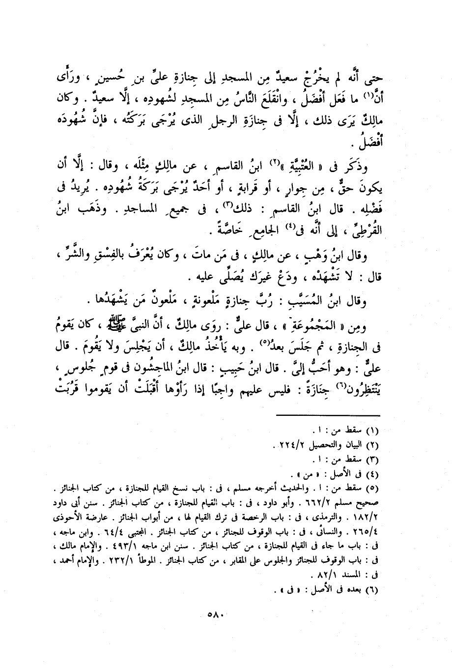حتى إنه لم يخرج سعيد من المسجد إلى جنازة علي بن حسين، ورأى أن ما فعل أفضل، وانقلع الناس من المسجد لشهوده، إلاَّ سعيد. وكان مالك يري ذلك، إلاَّ في جنازة الرجل الذي يرجي بركته، فإن شهوده أفضل.