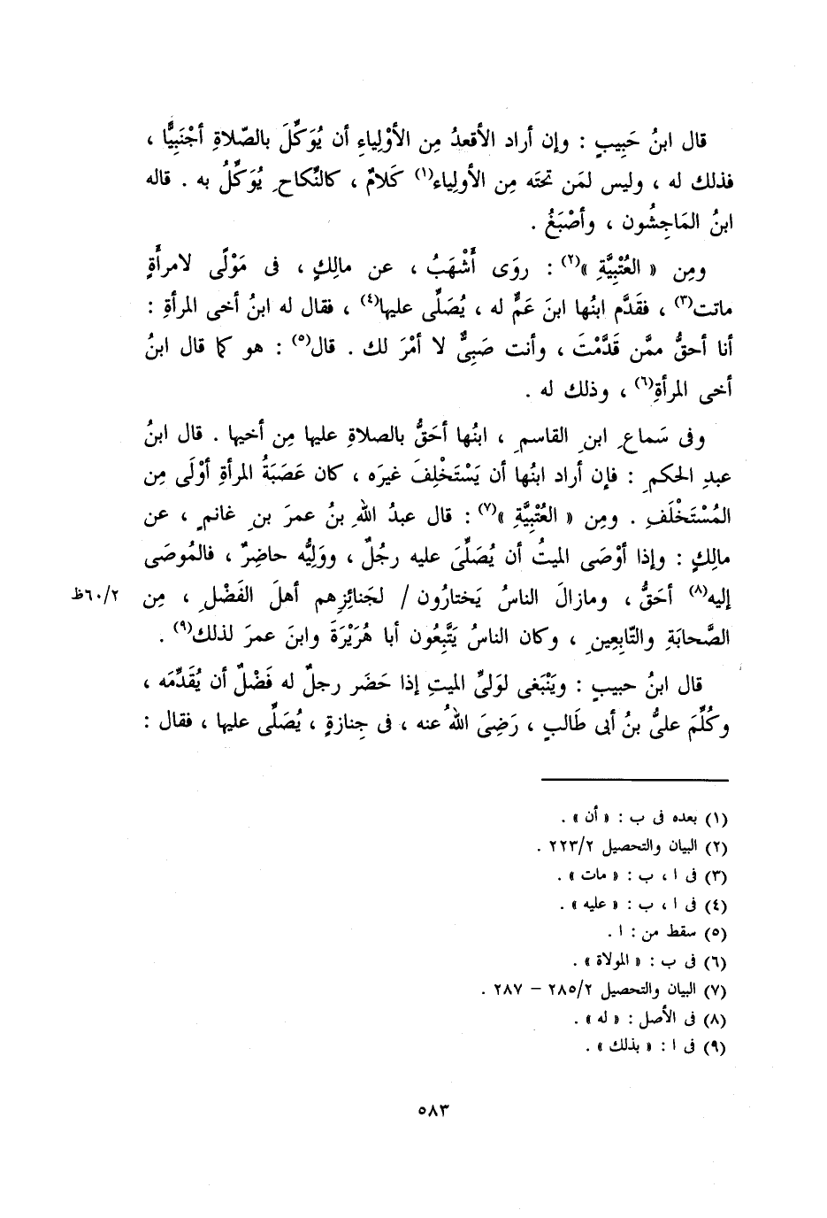 وفي سماع ابن القاسم، ابنها أحق بالصلاة عليها من أخيها. قال ابن عبد الحكم: فإن أراد ابنها أن يستخلف غيره، كان عصبة المرأة أولي من المستخلف. ومن (العتبية): قال عبد الله بن عمر بن غانم، عن مالك: وإذا أوصيى الميت يصلي عليه رجل، ووليه حاضر، فالموصي إليه أحق، ومازال الناس يختارون لجنائزهم أهل الفضل، من الصحابة والتابعين، وكان الناس يتبعون أبا هريرة وابن عمر لذلك.