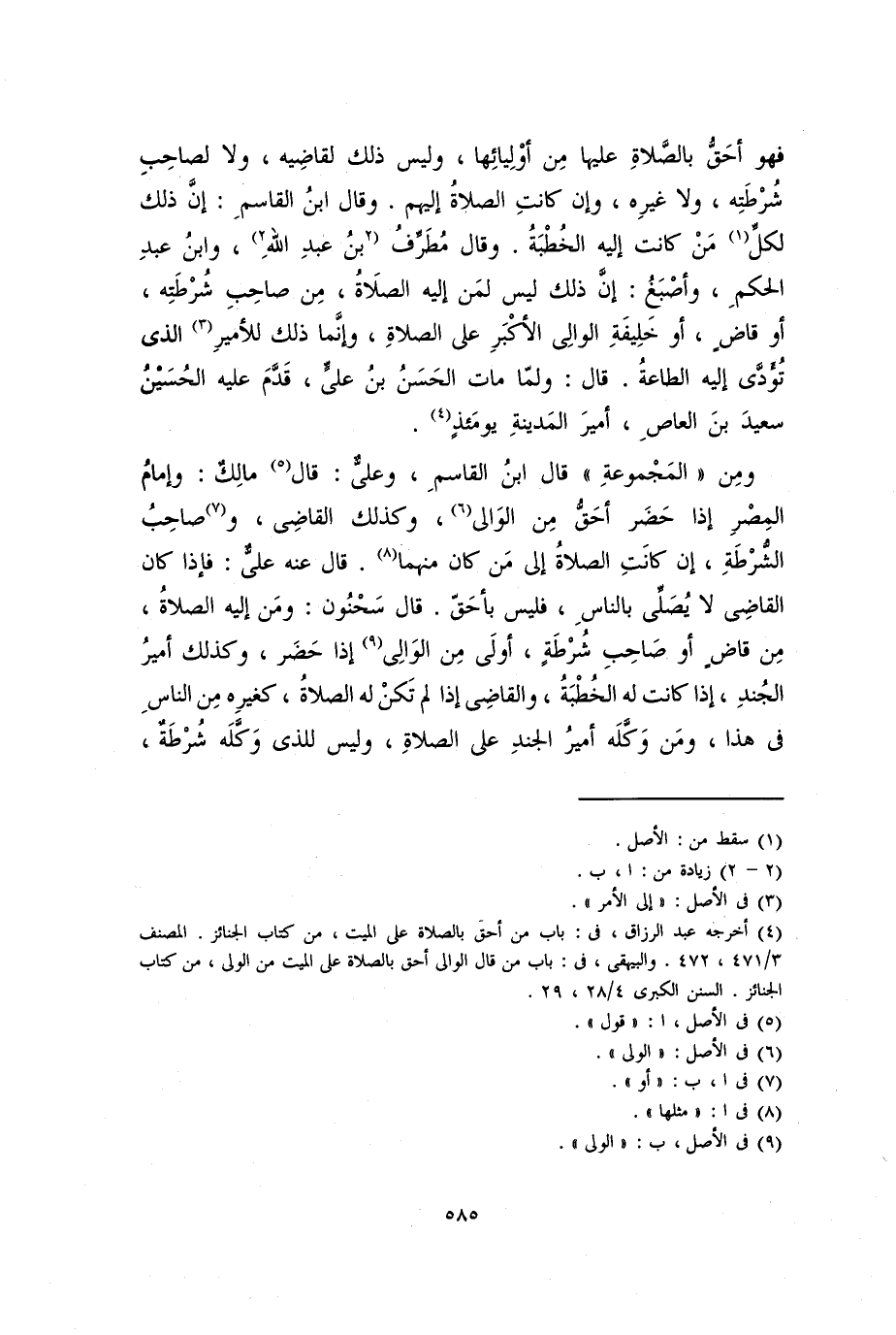 فهو أحق بالصلاة عليها من أوليائها، وليس ذلك لقاضيه، ولا لصاحب شرطته، ولا غيره، وإن كانت الصلاة إليهم. وقال ابن القاسم: إن ذلك لكل من كانت إليه الخطبة. وقال مُطَرِّف بن عبد الله، وابن عبد الحكم، وأصبغ: إن ذلك ليس لمن إليه الصلاة، من صاحب شرطته، أو قاض، أو خليفة الوالي الأكبر على الصلاة، وإنما ذلك للأمير الذي تؤدي إليه الطاعة. قال: ولما مات الحسن بن علي، قدم عليه الحسين سعيد بن العاص، أمير المدينة يومئذ.