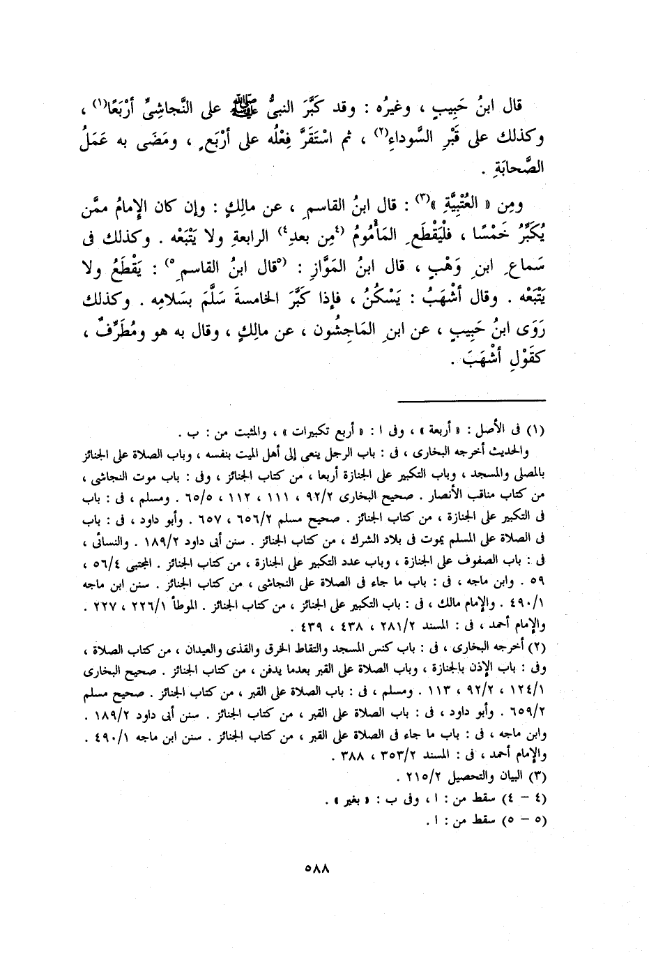 قَالَ ابْنُ حَبِيبٍ، وغيره: وقد كبر النبي صلى الله عليه وسلم على النجاشي أربعا، وكذلك على قبر السوادء، ثم استقر فعله على أربع، ومضي به عمل الصحابة. ومن (العتبية): قال ابن القاسم، عن مالك: وإن كان الإمام ممن يكبر خمسا، فليقطع المأموم من بعد الرابعة ولا يتبعه. وكذلك في سماع ابن وهب، قال ابن المواز: قال ابن القاسم: يقطع ولا يتبعه. وقال أشهب: يسكن، ف‘ذا كبر الخامسة سلم بسلامه. وكذلك روى ابن حبيب، عن ابن الماجشون، عن مالك، وقال به هو وَمُطَرِّف كقول أشهب.