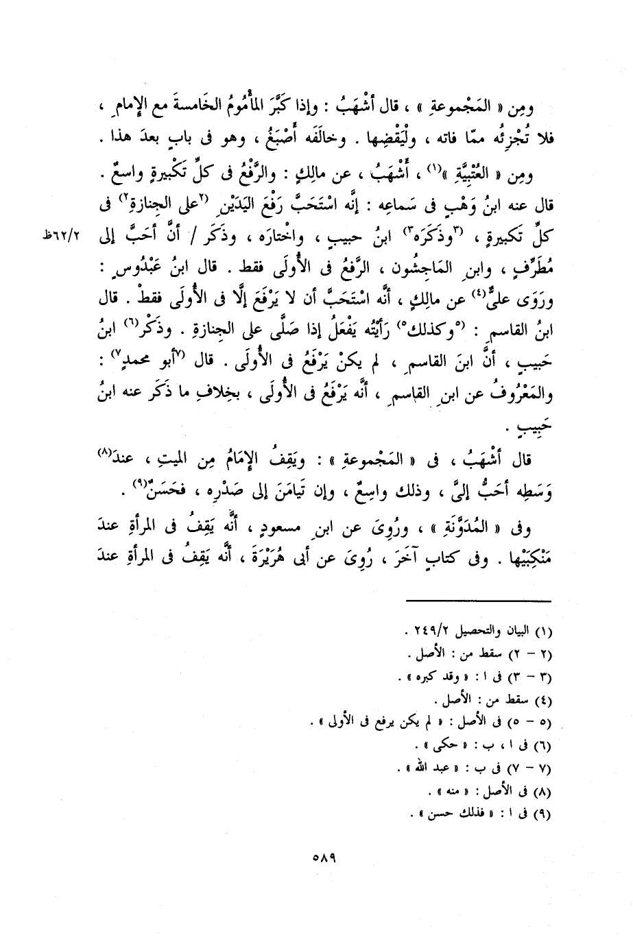 قال عنه ابن وهب في سماعه: إنه استحب رفع اليدين على الجنازة في كل تكبيرة، وذكره ابن حبيب، واختاره، وذكر أن أَحَبُّ إليَّ مُطَرِّف، وابن الماجشون، الرفع في الأولى فقط. قال ابن عبدوس: وَرَوَى علي عن مالك، أنه استحب أن لا يرفع إلاَّ في الأولى فقط. قال ابن القاسم: وكذلك رأيته يفعل إذا صلى على الجنازة. وذكر حبيب، أن ابن القاسم، لم يكن في الأولى. قال أبو محمد: والمعروف عن ابن القاسم، أنه يرفع في الأولى، بخلاف ما ذكر عنه ابن حبيب.
