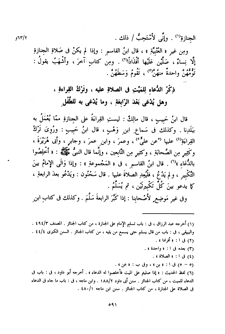 قَالَ ابْنُ حَبِيبٍ، قال مالك: ليست القراءة على الجنازة مما يعمل به ببلدنا. وكذلك في سماع ابن وهب، قَالَ ابْنُ حَبِيبٍ: وَرَوَى ترك القراءة عليها عن علي، وعمر، وابن عمر، وجابر، وأبي هريرة، وكثير من الصحابة، وكثير من التابعين، وإنما قال النبي صلى الله عليه وسلم: «أخلصوا بالدعاء». قال ابن القاسم، في (المجموعة): وإذا والى الإمام بين التكبير، ولم يدع، فليعد الصلاة عليها. قال سحنون: ويدعو بعد الرابعة، كما يدعو بين كل تكبيرتين، ثم يسلم.
