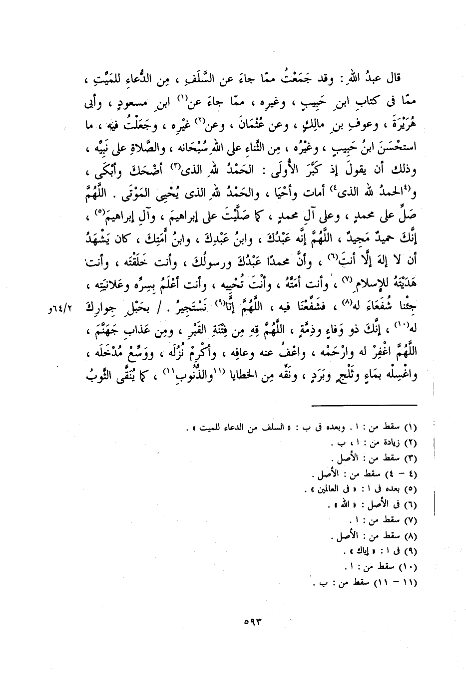 قال عبد الله: وقد جمعت مما عن السلف، من الدعاء للميت، مما في كتاب ابن حبيب، وغيره مما جاء عن ابن مسعود، وأبي هريرة، وعوف بن مالك، وعن عثمان، وعن غيره، وجعلت فيه، ما استحسن ابن حبيب، وغيره، من الثناء على الله سبحانه، والصلاة على نبيه، وذلك أن يقول إذ كبر الأولى: الحمد لله الذي أضحك وأبكي، والحمد لله الذي أمات وأحيا، والحمد لله الذي يحيي الموتى. اللهم صل على محمد، وعلى آل محمد، كما صليت على إبراهيم، وآل إبراهيم، إنك حميد مجيد، اللهم إنه عبدك، وابن عبدك، وابن أمتك، كان يشهد أن لا إله إلاَّ أنت، وأن محمدا عبدك ورسولك، وأنت خلقته، وأنت هديته للإسلام، وأنت أمته، وأنت تحييه، وأنت أعلم بسره وعلانيته، جئنا سفعاء له، فشفعنا فيه، اللهم إنا نستجير. يحيل جوارك له، إنك ذو وفاء له وارحمه، واعف عنه وعافه، وأكرم نزله، ووسع مدخله، واغسله بماء وثلج وبرد، ونقه من الخطايا والذنوب، كما ينقي الثوب