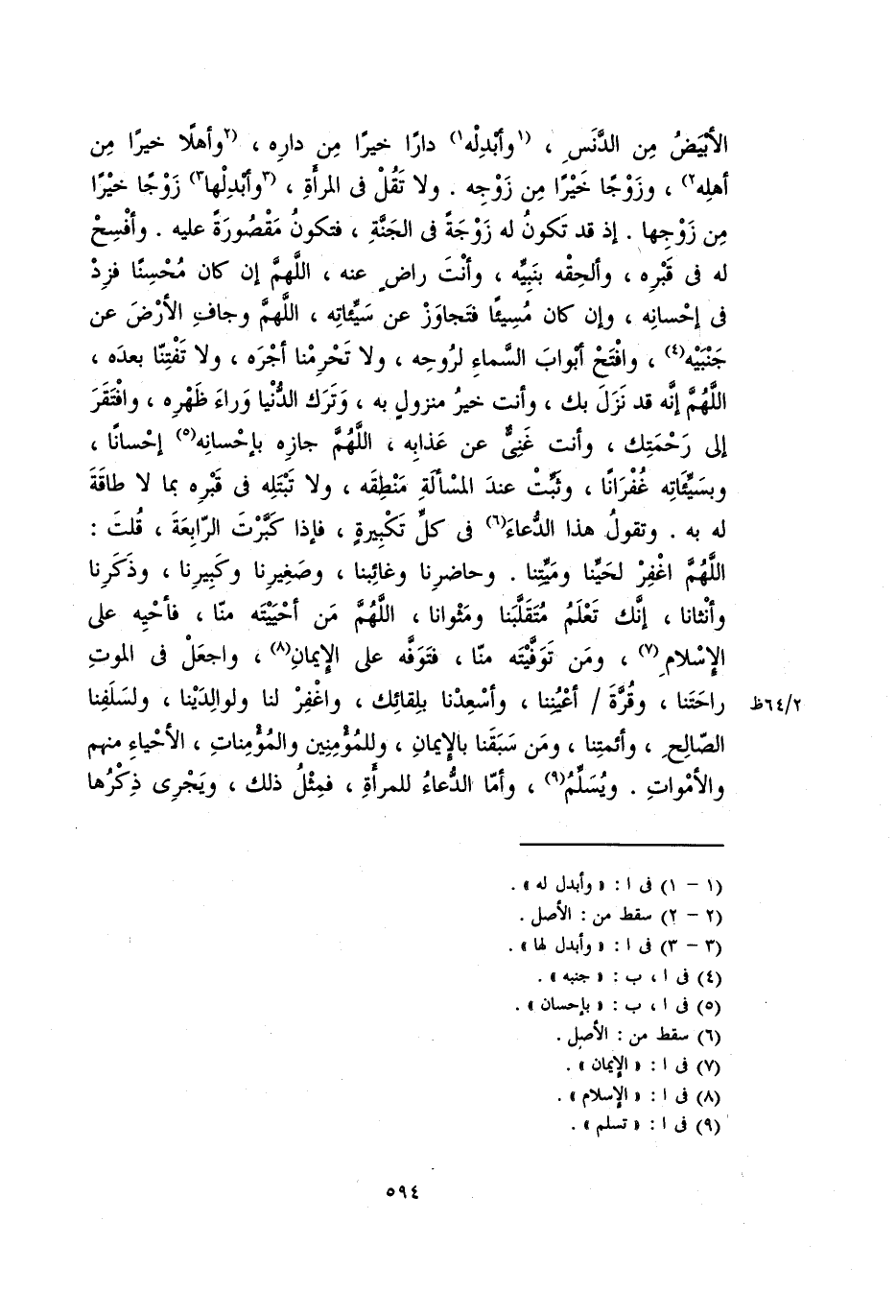 الأبيض من الدنس، وأبدله دارا خيرا من داره، وأهلا خيرا من أهله، وزوجا خيرا من زوجه. ولا تقل في المرأة، وأبدلها زوجا خيرا من زوجها. إذ قد تكون له زوجة في الجنة، فتكون مقصورة عليه. وأفسح له في قبره، وألحقه بنبيه، وأنت راض عنه، اللهم إن كان محسنا فزد في إحسانه، وإن كان مسيئا فتجاوز عن سيئاته، اللهم وجاف الرض عن جنبيه، وافتح أبواب السماء لروحه، ولا تحرمنا أجره، ولا تفتنا بعده، اللهم إنه قد نزل بك، وأنت خير منزل به، وترك الدنيا وراء ظهره، وافتقر إلى رحمتك، وأنت غني عن عذابه، اللهم جازه بإحسانه إحسانا، وبسيئاته غفرانا، وثبت عند المسأله منطقه، ولا تبتله في قبره بما لا طاقة له به. وتقول هذا الدعاء في كل تكبيرة، فإذا كبرت الرابعة، قلت اللهم اغفر لحينا وميتنا. وحاضرنا وغائبنا، وصغيرنا وكبيرنا، وذكرنا وأنثانا، إنك تعلم متقلبنا ومثوانا، اللهم من أحيينه منا، فأحيه على الإسلام، ومن توفيته منا، فتوفه على الإيمان، واجعل في الموت راحتنا، وقرة أعيننا، وأسعدنا بلقائك، واغفر لنا ولوالدينا، ولسلفنا الصالح، وأئمتنا، ومن سبقنا بالإيمان، وللمؤمنين والمؤمنات، الأحياء منهم والأموات. ويسلم، وأما الدعاء للمرأة، فمثل ذلك، ويجرى ذكرها