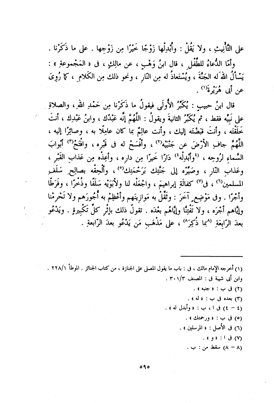 قَالَ ابْنُ حَبِيبٍ: يكبر الأولى فيقول ما ذكرنا من حمد الله، والصلاة على نبيه فقط، ثم يكبر الثانية ويقول: اللهم إنه عبدك، وابن عبدك، أنت خلقته، وأنت قبضته إليك، وأنت عالم بما كان عاملا به وصائرا إليه، اللهم جاف الأرض عن جنبيه، وأفسح له في قبره، وافتح أبواب السماء لروحه، وأبدله دارا خيرا من داره، وأعذه من عذاب القبر، وعذاب النار، وصيره إلى جنتك برحمتك، وألحقه بصالح سلف المسلمين، في كفالة إبراهيم، واجعله لنا ولأبويه سلفا وذخرا، وفرطا وأجرا. وفي موضع آخر: وثقل به موازينهم وأعظم به أجورهم ولا تحرمنا وإياهم أجره، ولا يفقتنا وإياهم بعده. تقول ذلك بإثر كل تكبيرة. ويدعو بعد الرابعة بما ذكر، على مذهب من يدعو بعد الرابعة.