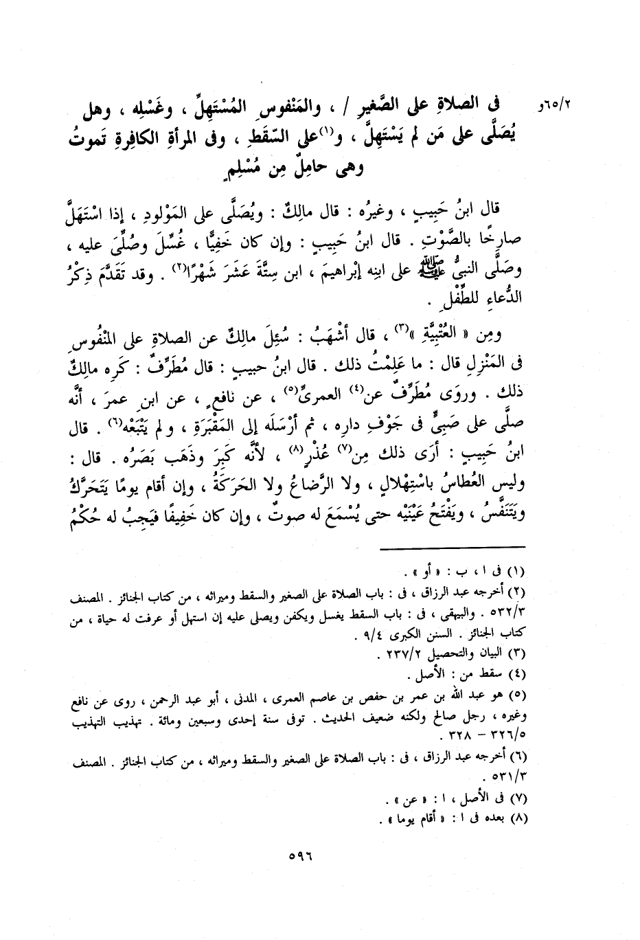 ومن (العتبية)، قال أشهب: سئل مالك عن الصلاة على المنفوس في المنزل قال: ما علمت ذلك. قَالَ ابْنُ حَبِيبٍ: قال مُطَرِّف: كره مالك ذلك. وَرَوَى مُطَرِّف عن العمرى، عن نافع، عن ابن عمر، أنه صلى على صبي في جوف داره، ثم أرسله إلى المقبرة، ولم يتبعه. قَالَ ابْنُ حَبِيبٍ: أرى ذلك من عذر، لأنه كبر وذهب بصره. قال: وليس العطاس باستهلال، ولا الرضع ولا الحركة، وإن أقام يوما يتحرك ويتنفس، ويفتح عينيه حتى يسمع له صوت، وإن كان خفيفا فيجب له حكم